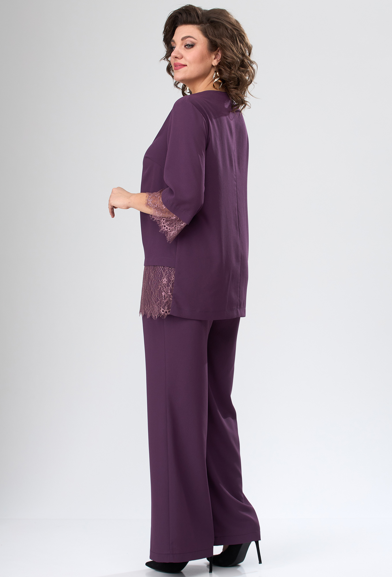 Модель: Анастасия Мак 1079 т.сирень <..показатьli>Рост: 164 см (девушка на фото ростом 170см) Сезон: Круглогодичный Тип ткани: 100% ПЭКостюм состоит из блузки и брюк. Костюм выполнен из однотонной ткани, в качестве отделки использовано кружевное полотно. Блузка прямого силуэта. Полочка блузки с нагрудными вытачками, горловиной круглой формы, в нижней части полочки обработана кокетка с наложением кружевного полотна. Спинка со средним швом. Рукав длиной ¾, втачной, одношовный. По низу рукав обработан притачной манжетой из кружевного полотна. Брюки свободные, прямые, типа “поло”. На передней половинке выполнены наклонные карманы. Брюки на притачном поясе с эластичной тесьмой.