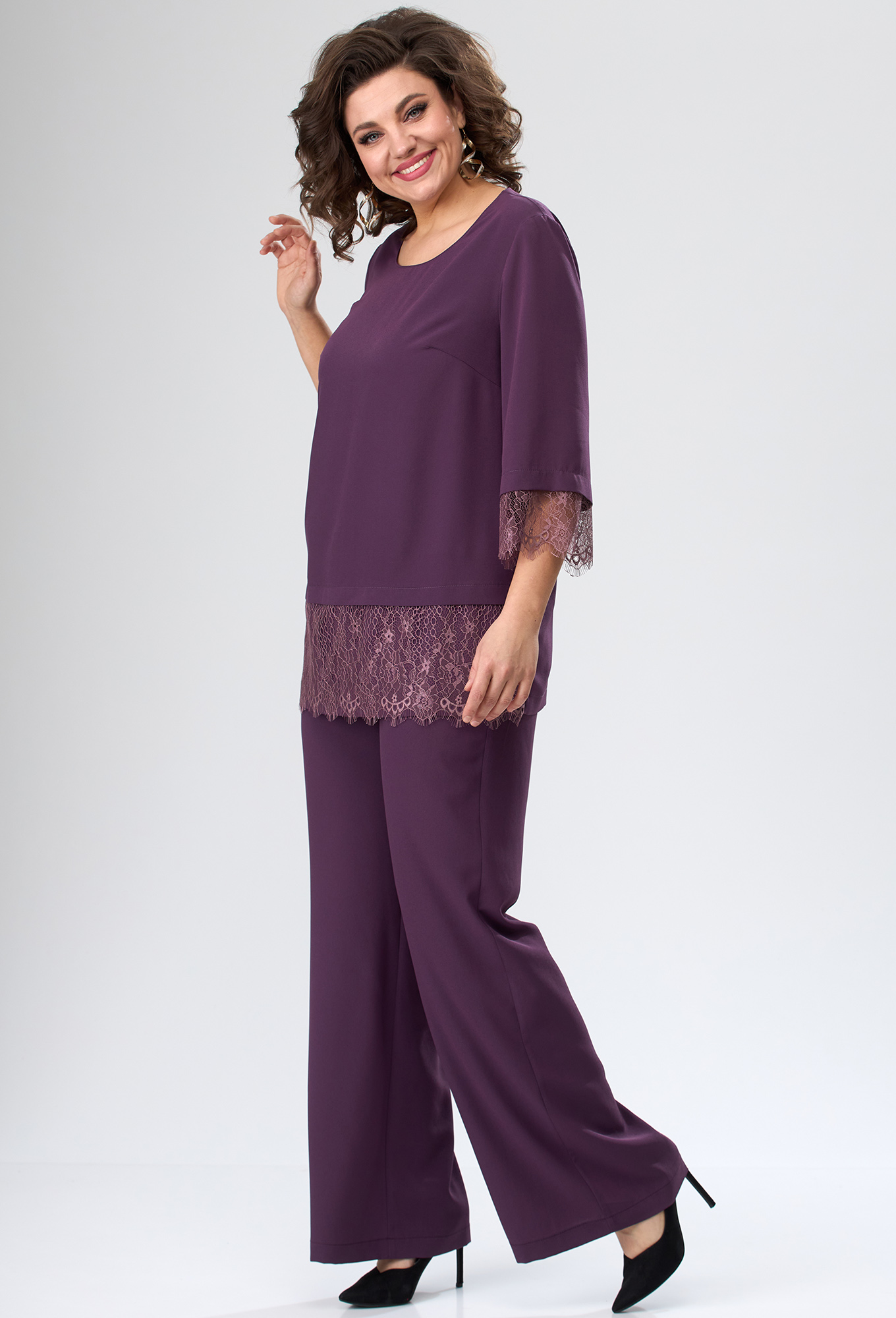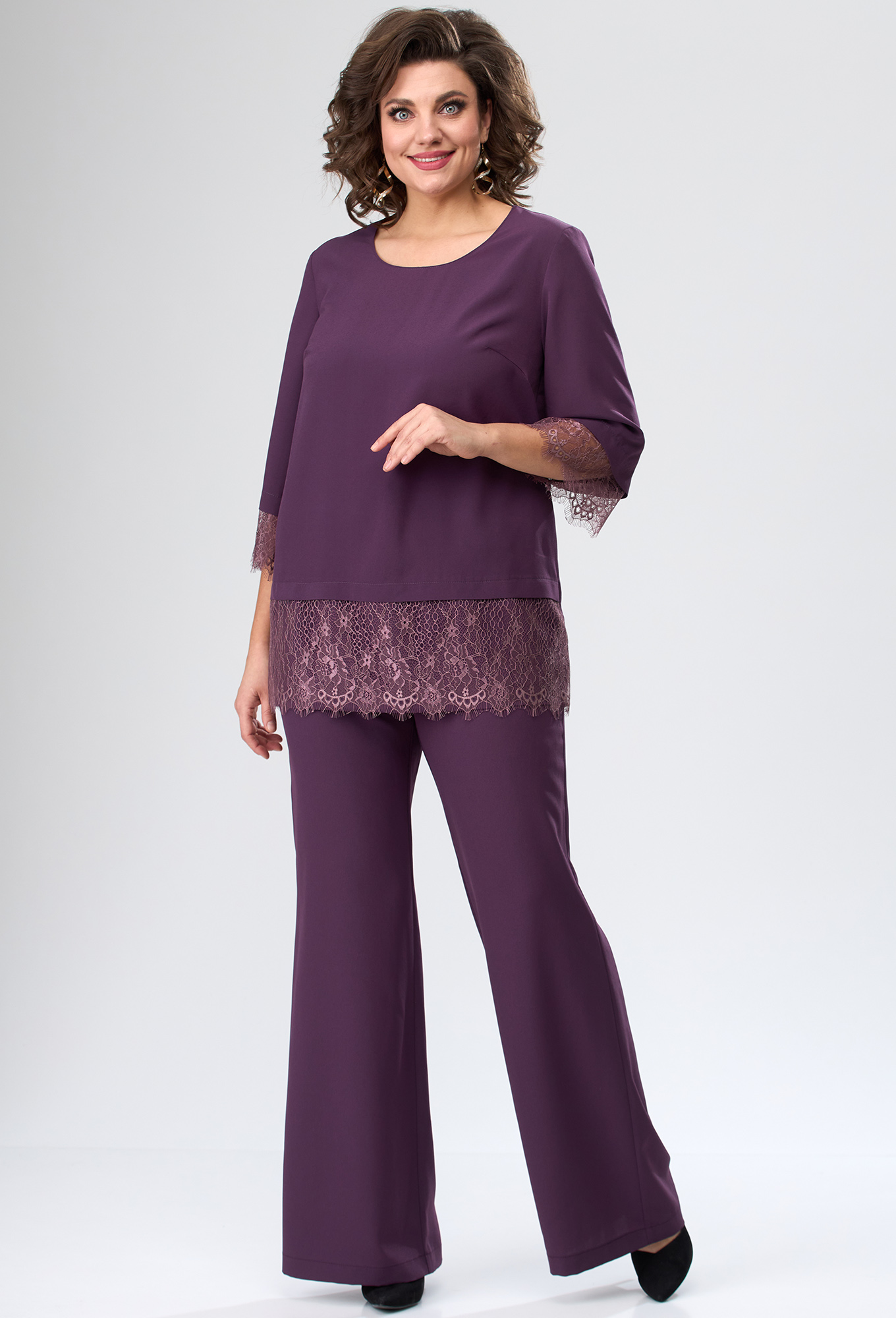 Модель: Анастасия Мак 1079 т.сирень <..показатьli>Рост: 164 см (девушка на фото ростом 170см) Сезон: Круглогодичный Тип ткани: 100% ПЭКостюм состоит из блузки и брюк. Костюм выполнен из однотонной ткани, в качестве отделки использовано кружевное полотно. Блузка прямого силуэта. Полочка блузки с нагрудными вытачками, горловиной круглой формы, в нижней части полочки обработана кокетка с наложением кружевного полотна. Спинка со средним швом. Рукав длиной ¾, втачной, одношовный. По низу рукав обработан притачной манжетой из кружевного полотна. Брюки свободные, прямые, типа “поло”. На передней половинке выполнены наклонные карманы. Брюки на притачном поясе с эластичной тесьмой.