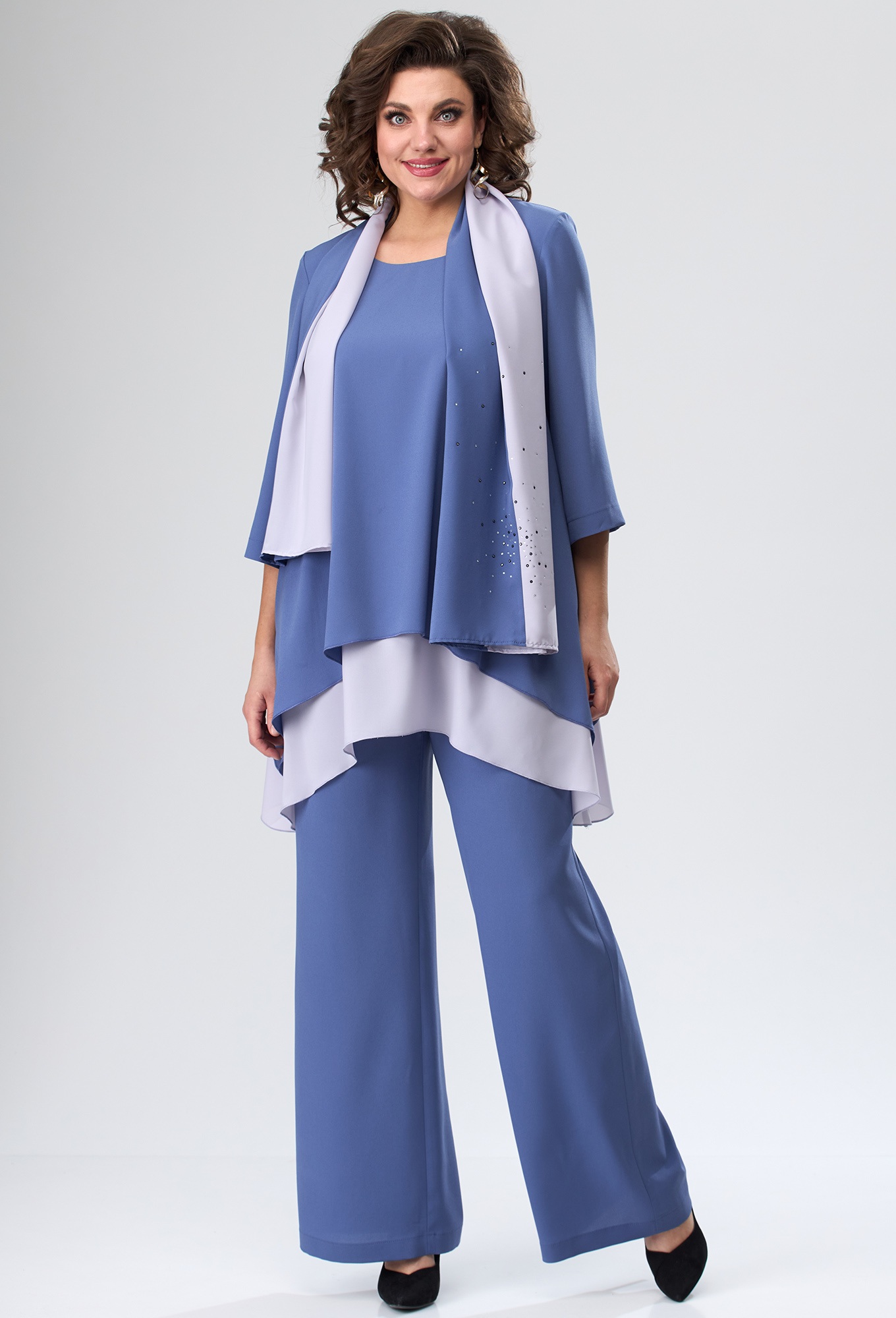 Модель: Анастасия Мак 1086 индиго ..показать>Рост: 164 см (девушка на фото ростом 170см) Сезон: Круглогодичный Тип ткани: 100% ПЭКостюм состоит из шарфа, блузки и брюк. Костюм выполнен из однотонной ткани, в качестве отделки использован однотонный шифон. Блузка А-образного силуэта, двухлойная. Полочка блузки с нагрудными вытачками, горловиной круглой формы. Спинка со средним швом. Рукав длиной ¾, втачной, одношовный. Низ блузки ассиметричный, с удленеными углами боковых швов._x000D_
