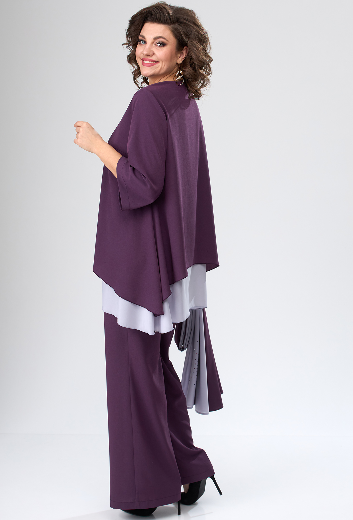 Модель: Анастасия Мак 1086 т.сирень <..показатьli>Рост: 164 см (девушка на фото ростом 170см) Сезон: Круглогодичный Тип ткани: 100% ПЭКостюм состоит из шарфа, блузки и брюк. Костюм выполнен из однотонной ткани, в качестве отделки использован однотонный шифон. Блузка А-образного силуэта, двухлойная. Полочка блузки с нагрудными вытачками, горловиной круглой формы. Спинка со средним швом. Рукав длиной ¾, втачной, одношовный. Низ блузки ассиметричный, с удленеными углами боковых швов._x000D_