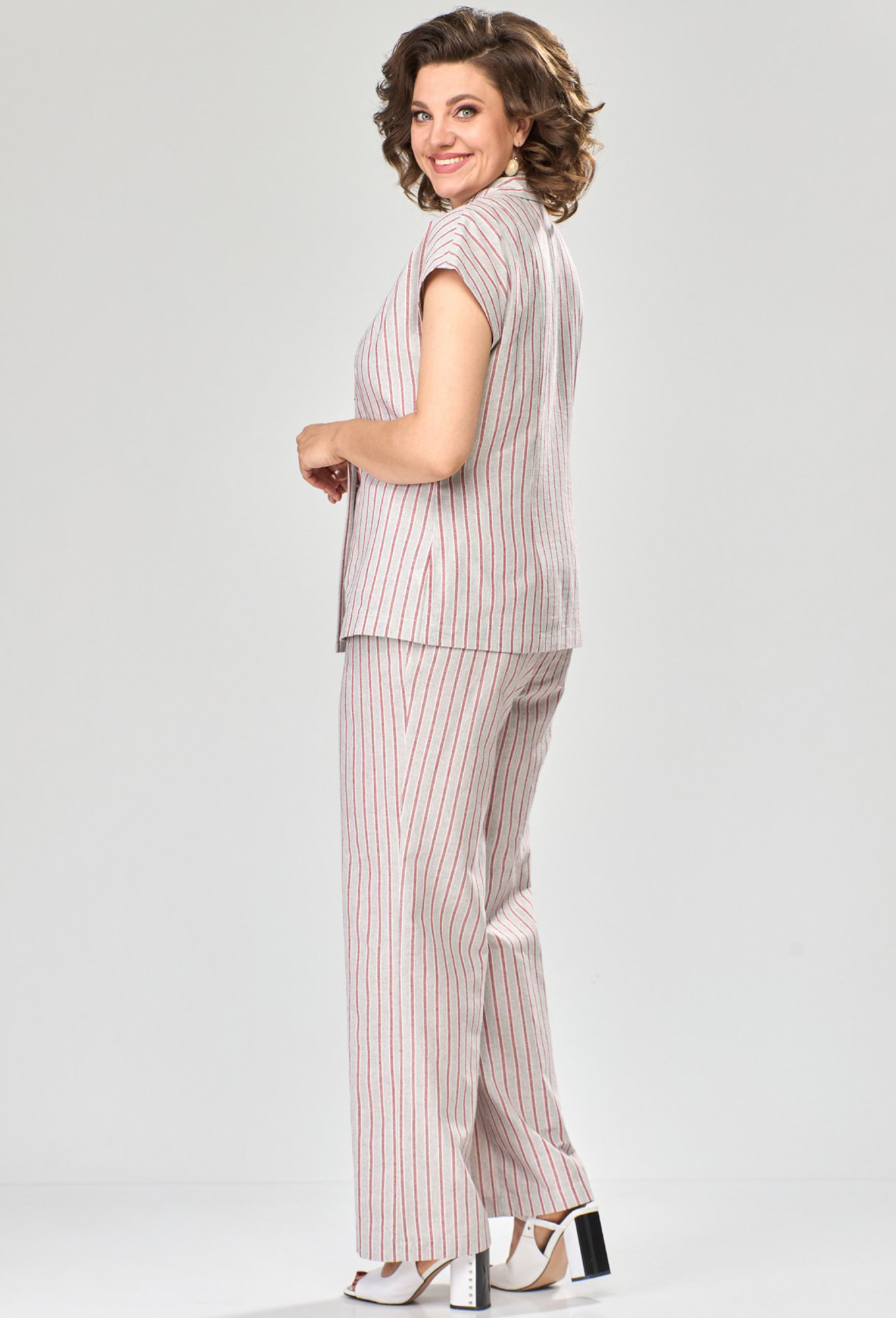Модель: Анастасия Мак 1109 красная полоска..показать Рост: 164 см (девушка на фото ростом 170см) Сезон: Весна-Лето Тип ткани: 63% хлопок, 33% ПА, 4% спандексКостюм состоит из жакета и брюк, выполнен из ткани в полоску. Жакет полуприлегающего силуэта, длинной чуть ниже линии бёдер. Жакет с двубортной открытой застёжкой на один ряд петель и пуговиц и воротником пиджачного тип. Полочка и спинка с рельефами от плечевого шва. Рукава цельнокроеные, короткие. Брюки прямые, длинные, свободные в верхней части, со стрелками. По передним половинкам выполнены карманы. Брюки на приталенном поясе с эластичной тесьмой и завязками спереди