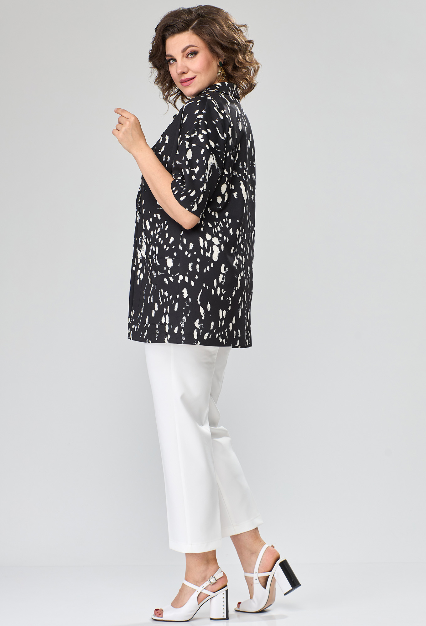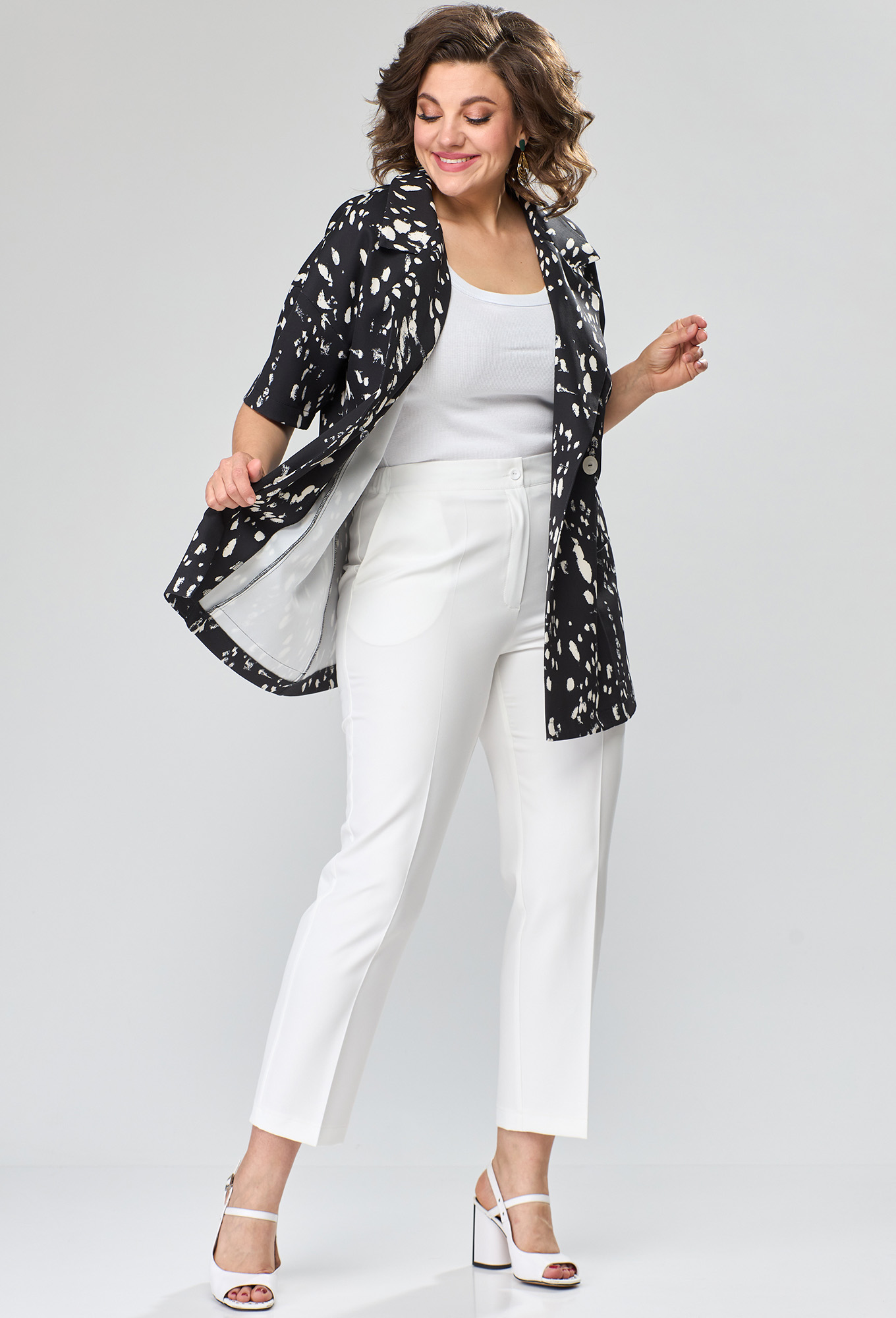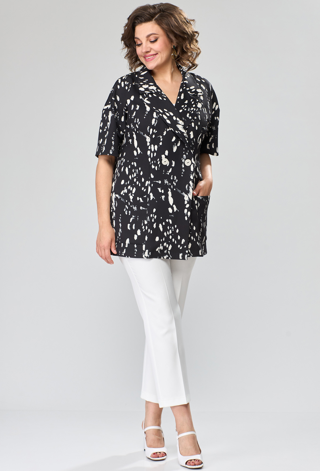 Модель: Анастасия Мак 1113 черный ..показать>Рост: 164 см (девушка на фото ростом 170см) Сезон: Весна-Лето Тип ткани: Жакет- 95 ПЭ%, 5% эластан, Брюки- 94 ПЭ, 6- спандексКостюм состоит из жакета и брюк. Жакет выполнен из ткани с набивным рисунком. Брюки из однотонной ткани._x000D_