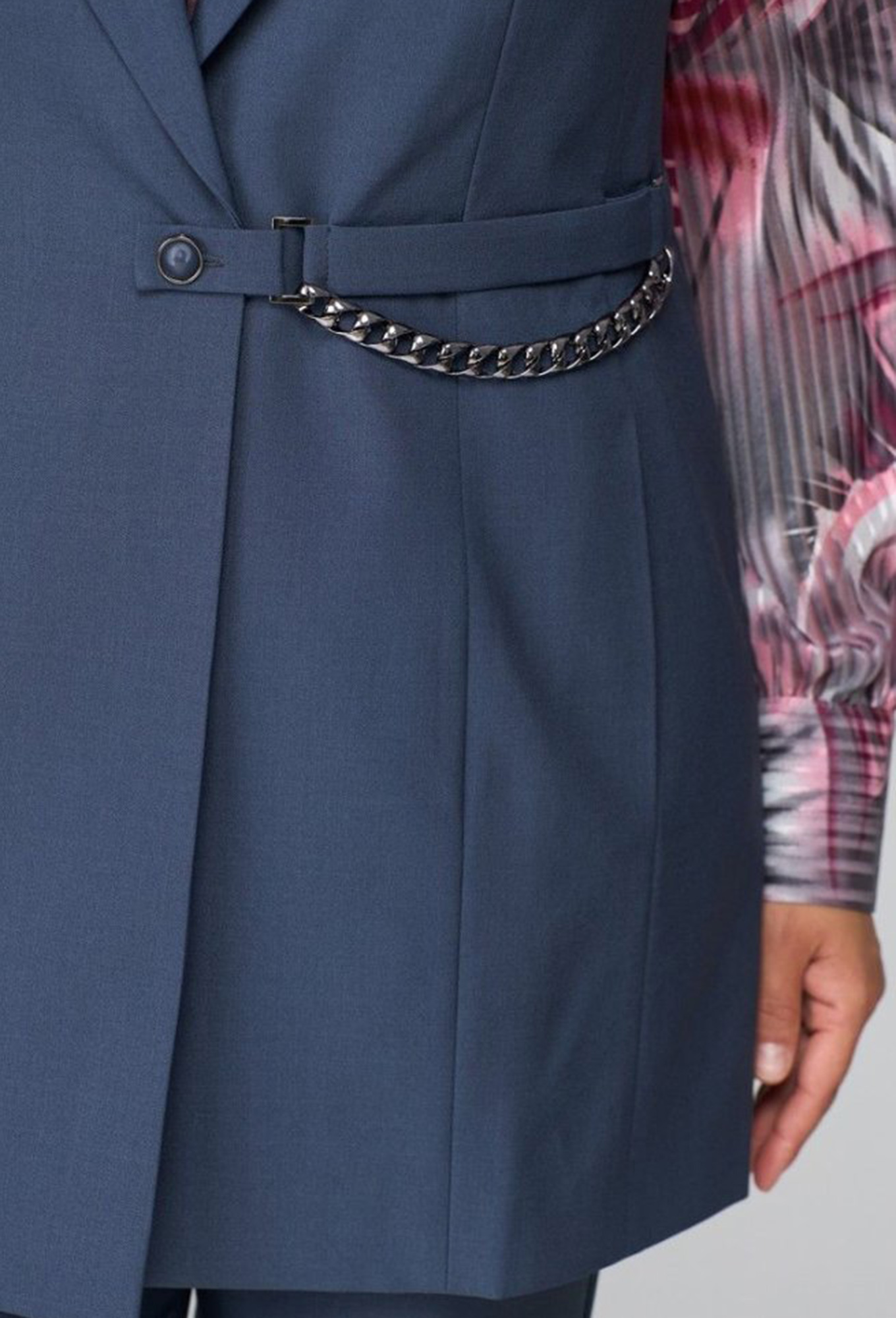 Жилет полуприлегающего силуэта, полочка жилета с вертикальными рельефами, с центральной застежкой на петлю и пуговицу. Горловина V-образной формы, воротник пиджачного типа с отложными лацканами. В рельефе полочки обработаны прорезные карманы. В области талии по полочке с левой стороны выполнен декоративный элемент в виде хлястика с пряжками, и цепью. Цепь сьемная. Спинка со средним швом и вертикальными рельефами. Жилет на подкладке._x000D_