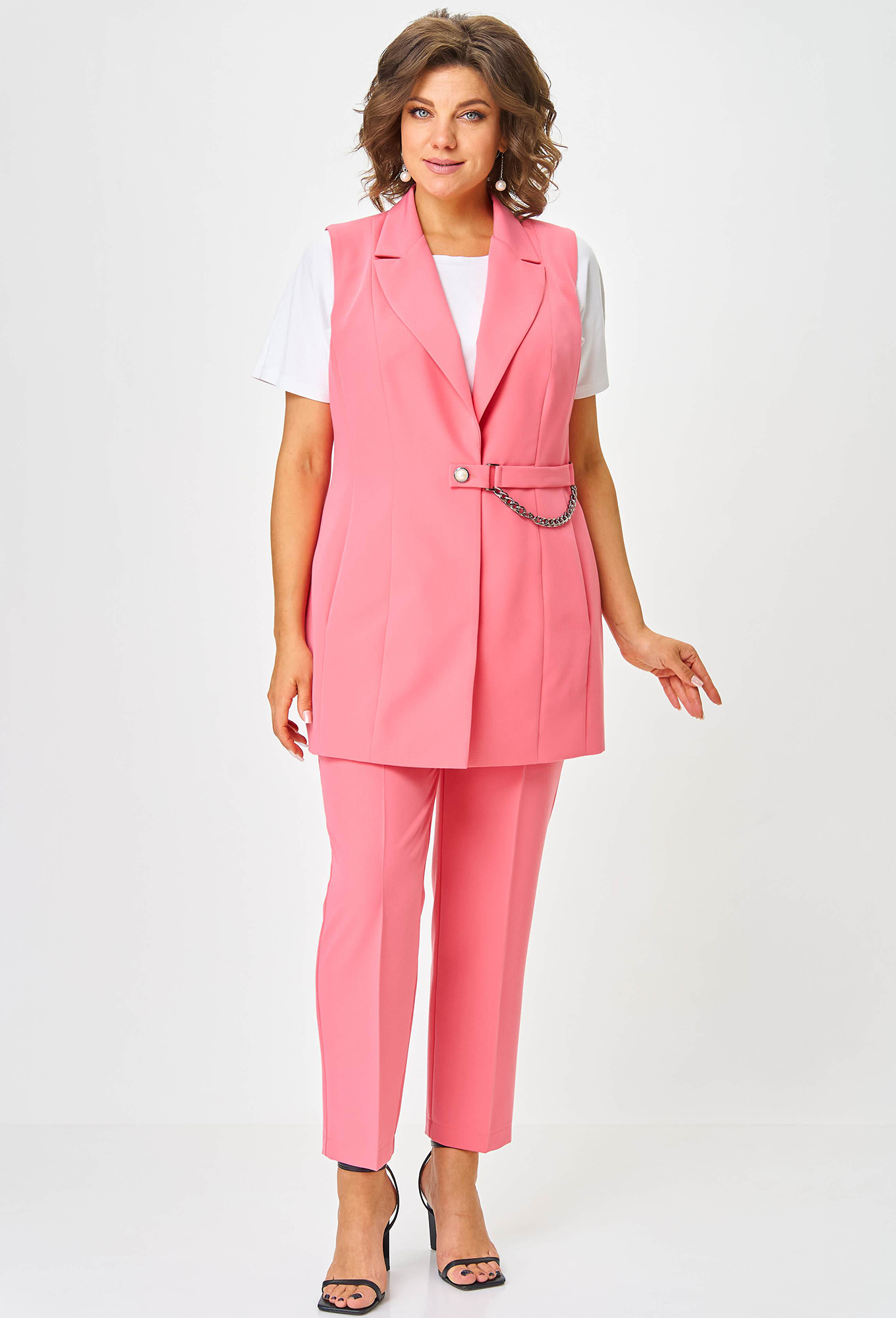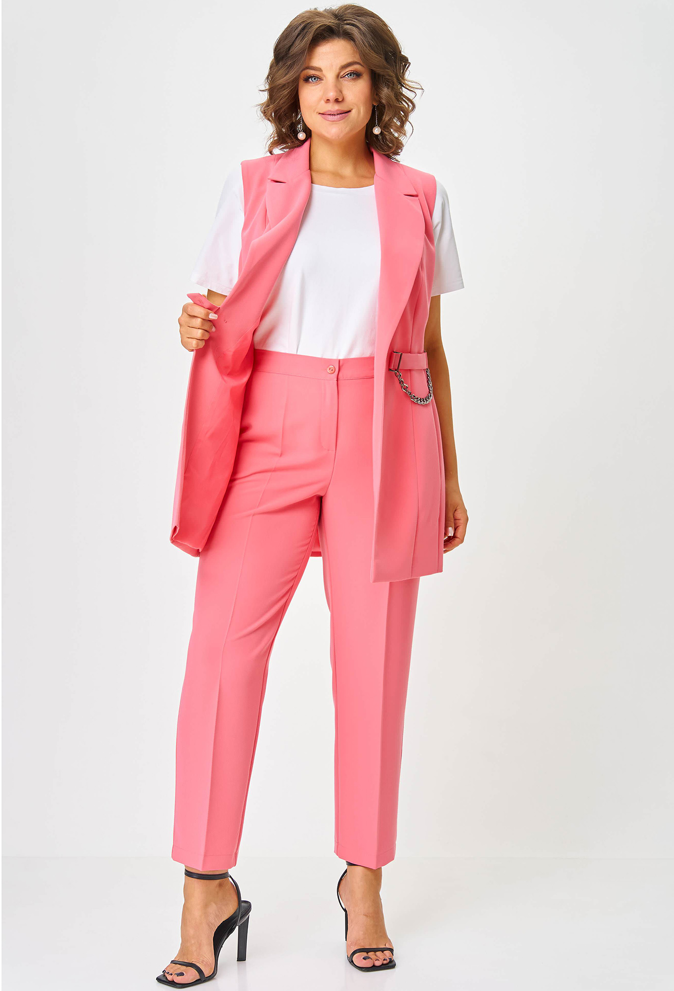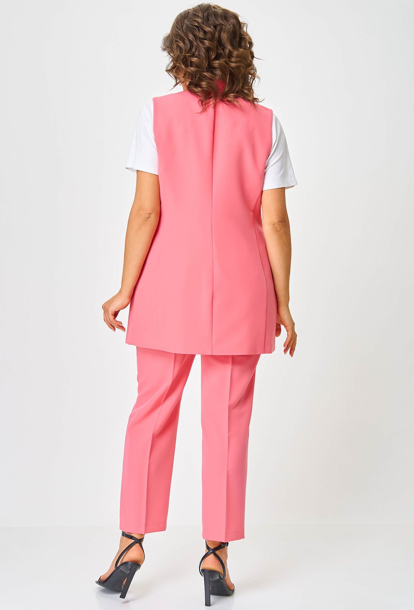 Длина жилета в 58р - 80,5 см, длина брюк по боковому шву без пояса - 97,3 см>Рост: 164 см (девушка на фото ростом 170см) Сезон: Весна-Лето Тип ткани: 75% ПЭ, 20% вискоза, 5% спандекс