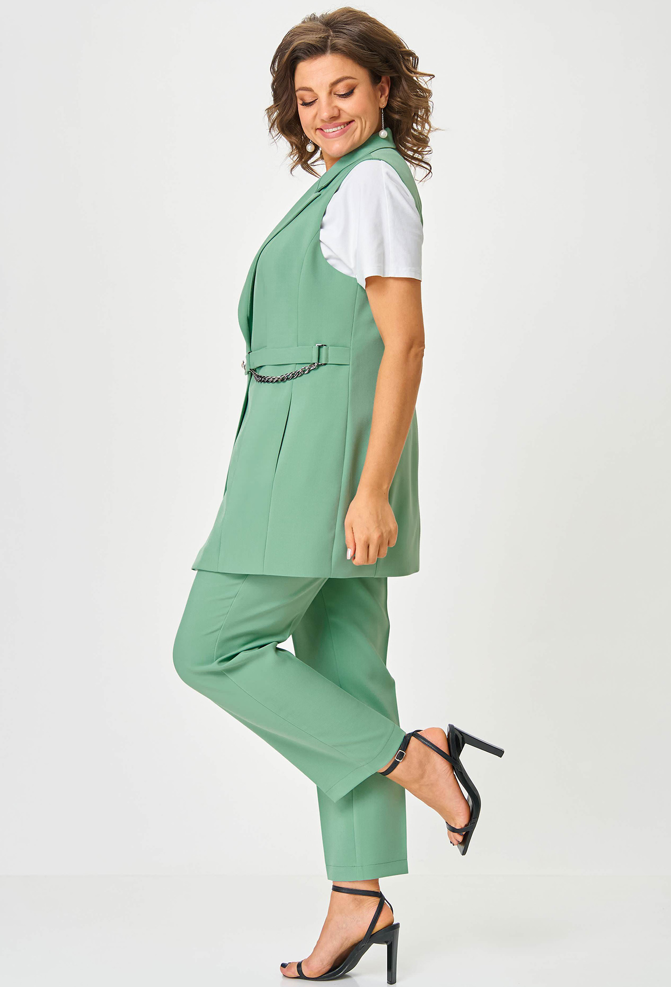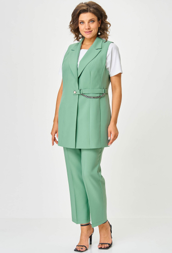 Модель: Анастасия Мак 1115 мятный ..показать>Рост: 164 см (девушка на фото ростом 170см) Сезон: Весна-Лето Тип ткани: 97% ПЭ, 3% спандексКостюм состоящий из жилета и брюк, выполнен из однотонной ткани. _x000D_