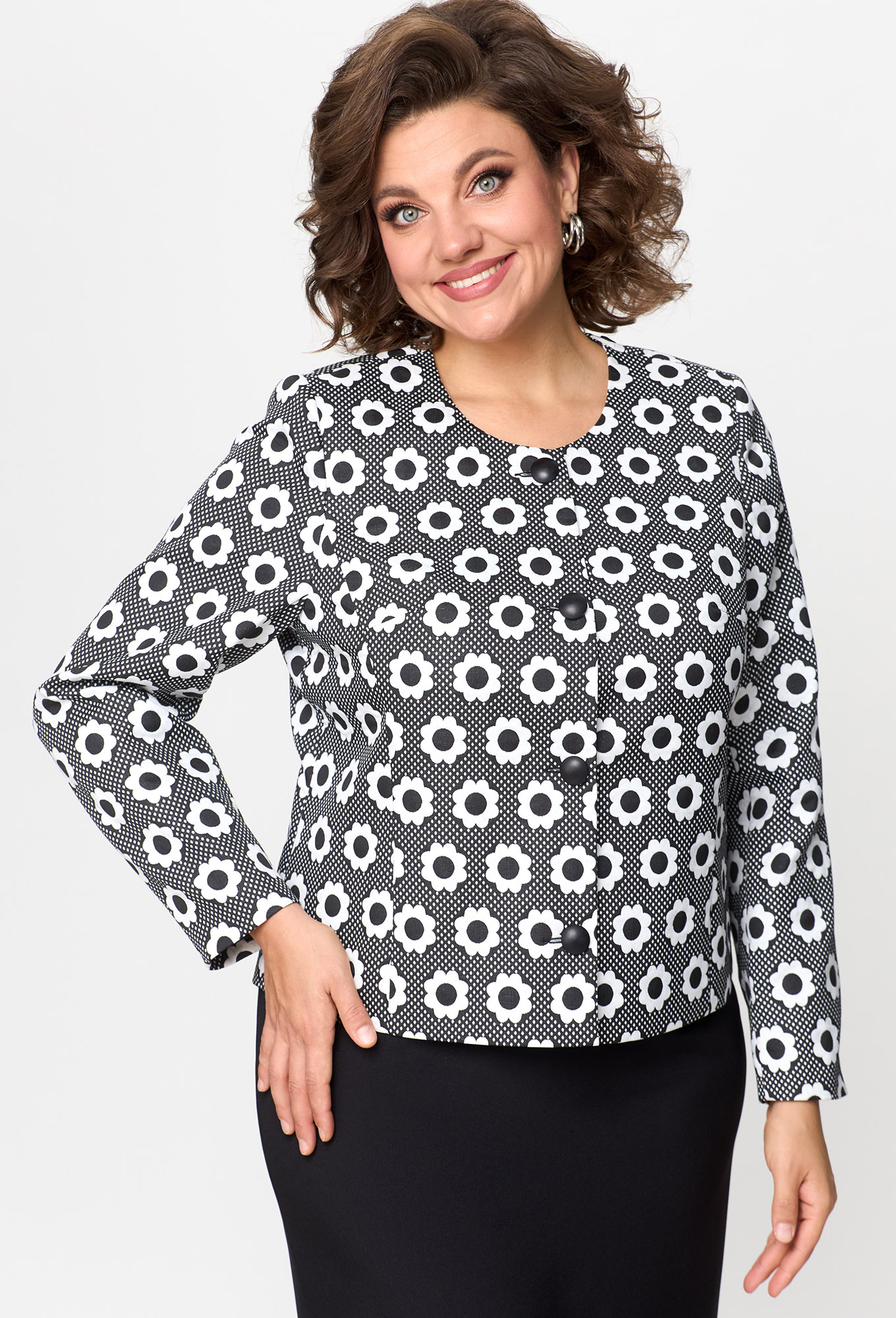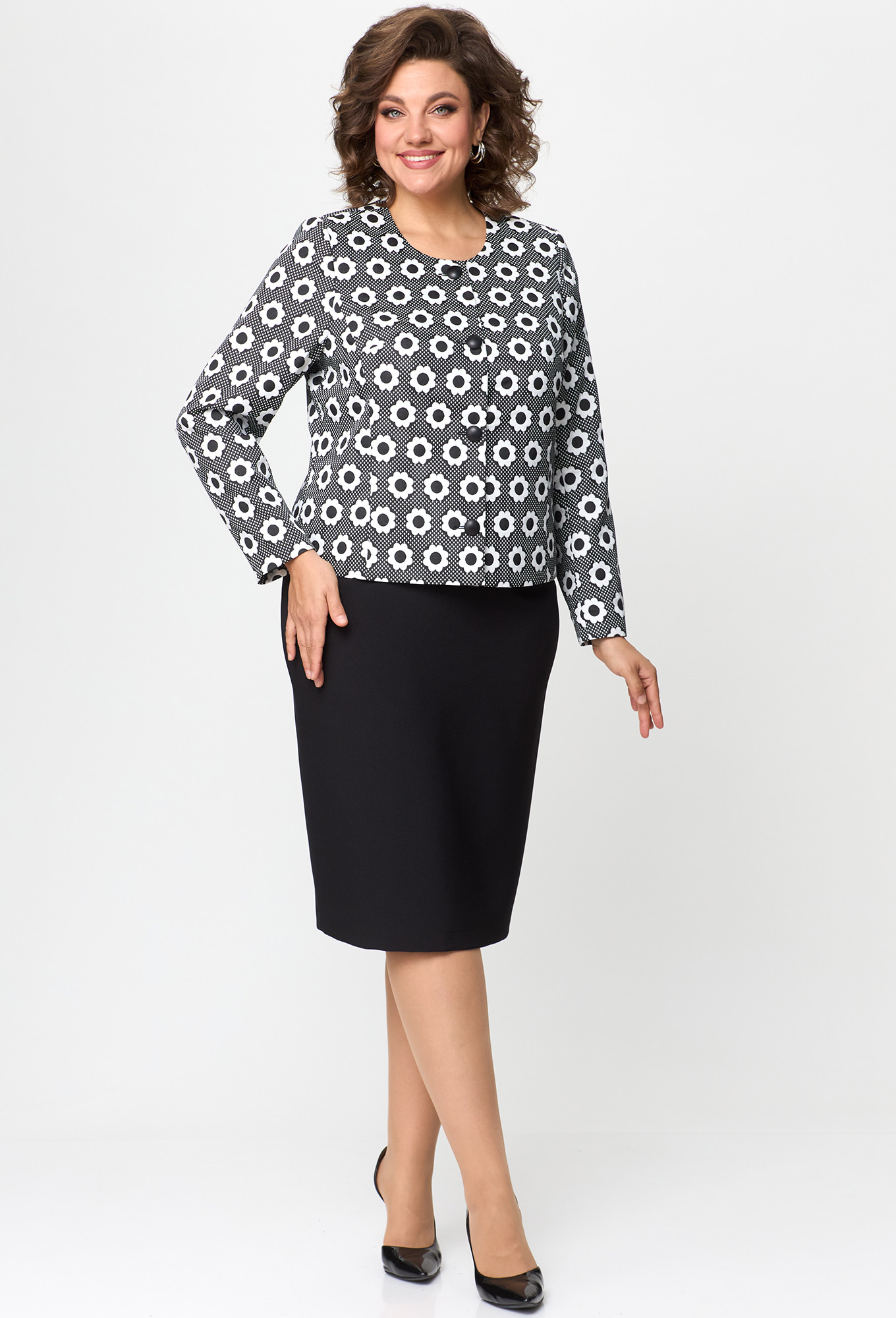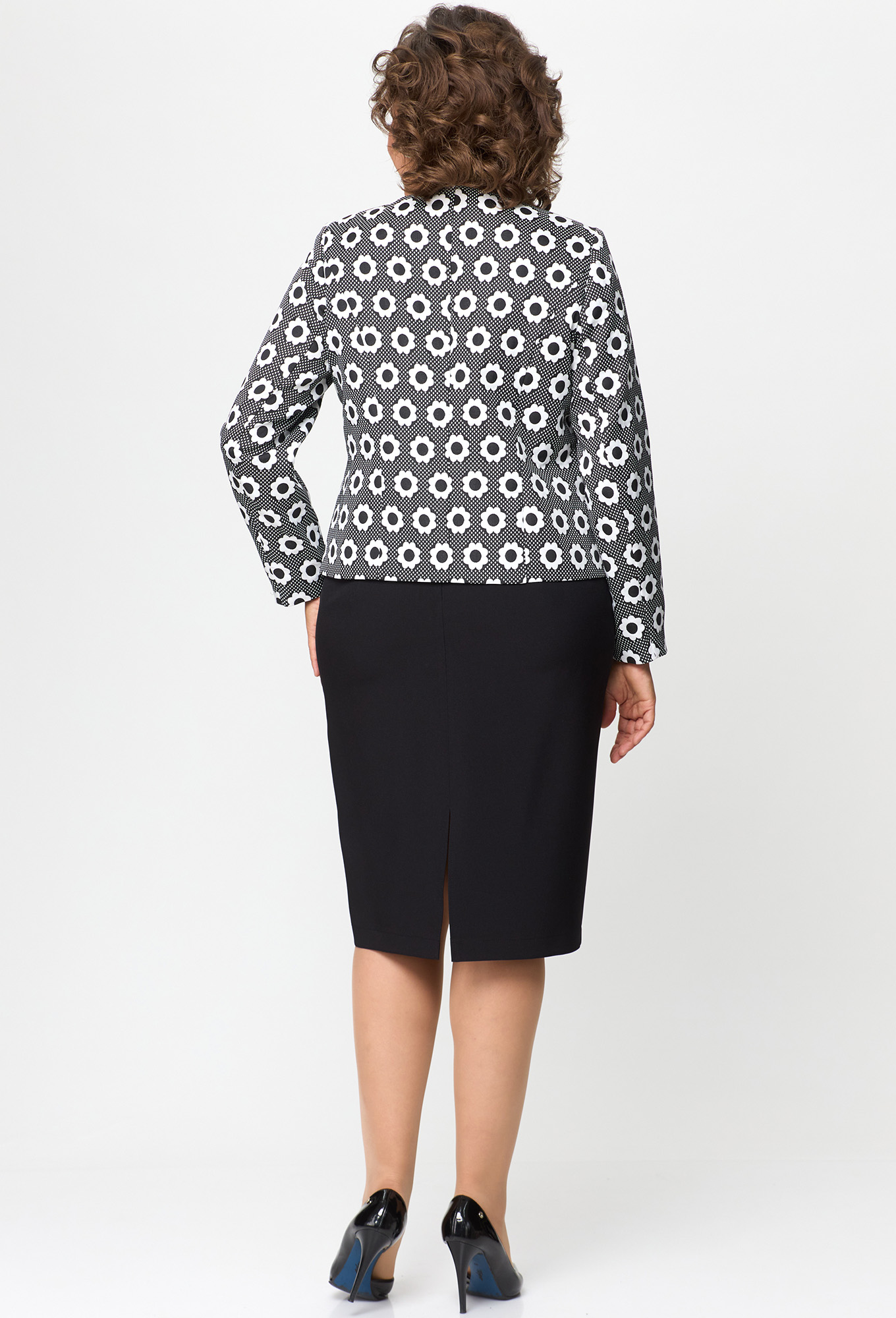 Модель: Анастасия Мак 1132 черный ..показать>Рост: 164 см (девушка на фото ростом 170см) Сезон: Круглогодичный Тип ткани: Жакет- 66 % ПЭ, 32% вискоза, 2% спандекс. Юбка- 100% ПЭКостюм состоит из жакета и юбки. Жакет полуприлегающего силуэта выполнен из жаккардовой пестротканой ткани, жакет на подкладке. Жакет с однобортной застежкой на петли и пуговицы. Полочка жакета с вертикальными рельефами. Горловина круглой формы. Спинка со средним швом и вертикальными рельефами. Рукав втачной, длинный, двухшовный.