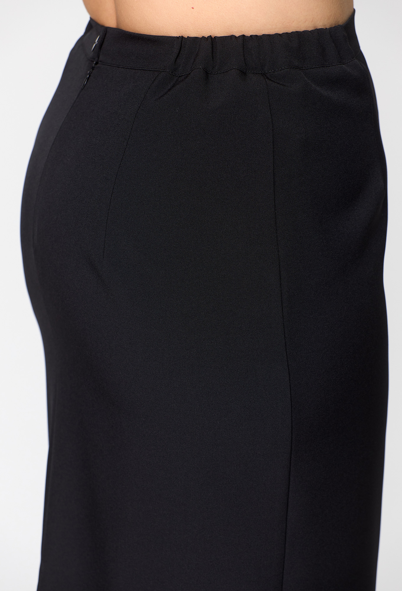 Юбка прилегающая по бедрам, зауженная к низу, длиной за колено, выполнена из однотонной ткани, юбка на подкладке. По передней половине обработаны талиевые вытачки, по задней половине талиевые вытачки и в верхней части среднего шва потайная молния, в нижней части разрез. По талии на притачном поясе с эластичной тесьмой и застежкой на петлю и пуговицу. Юбка на подкладке.