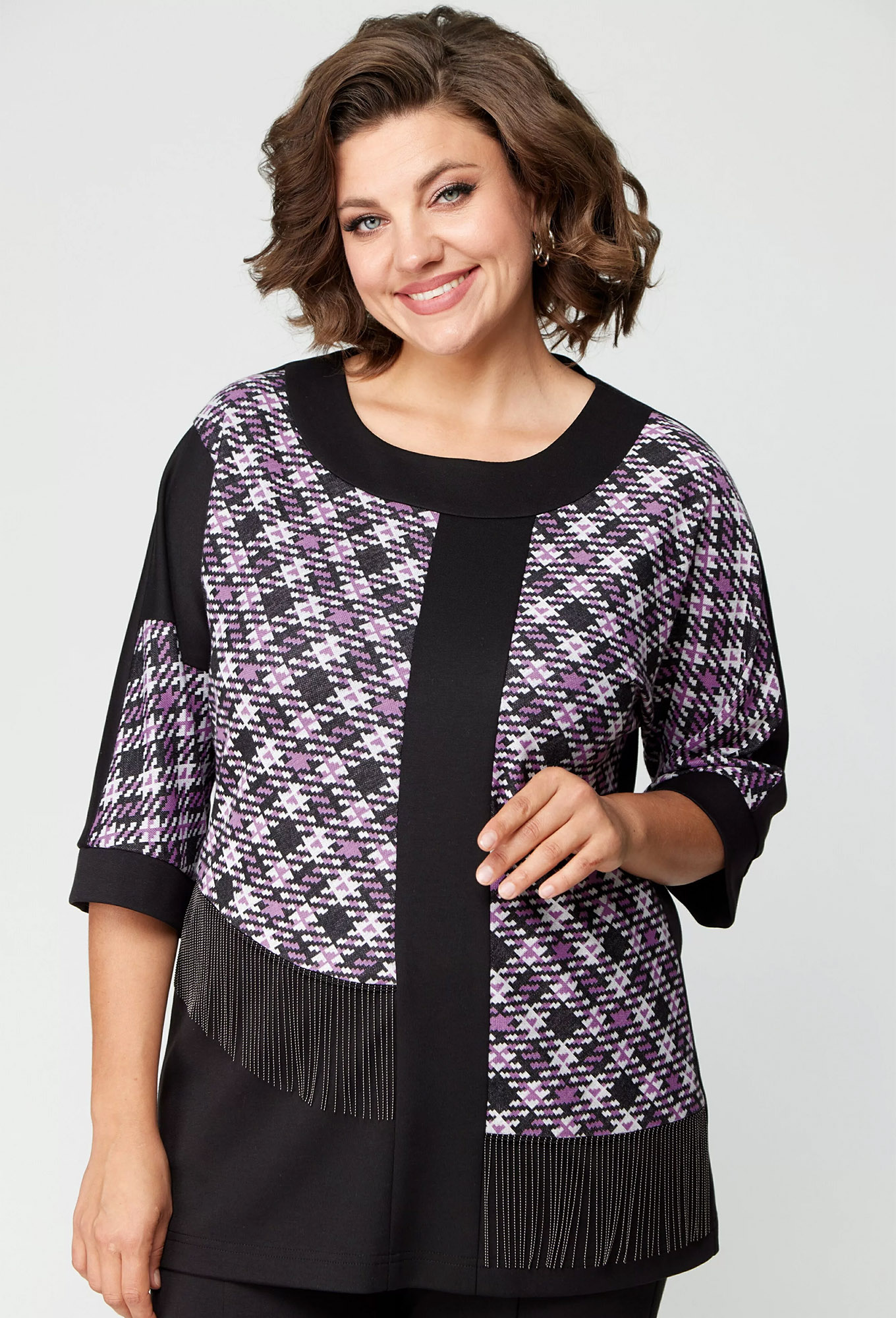 Джемпер свободного, прямого силуэта. Полочка с ассиметричными деталями из пестротканого трикотажного полотна. В качестве декора использована тесьма-бахрома из бусин. Горловина круглой формы. Спинка цельная. Рукав цельнокроеный, длиной 3\4. По низу рукав обработан притачной манжетой.