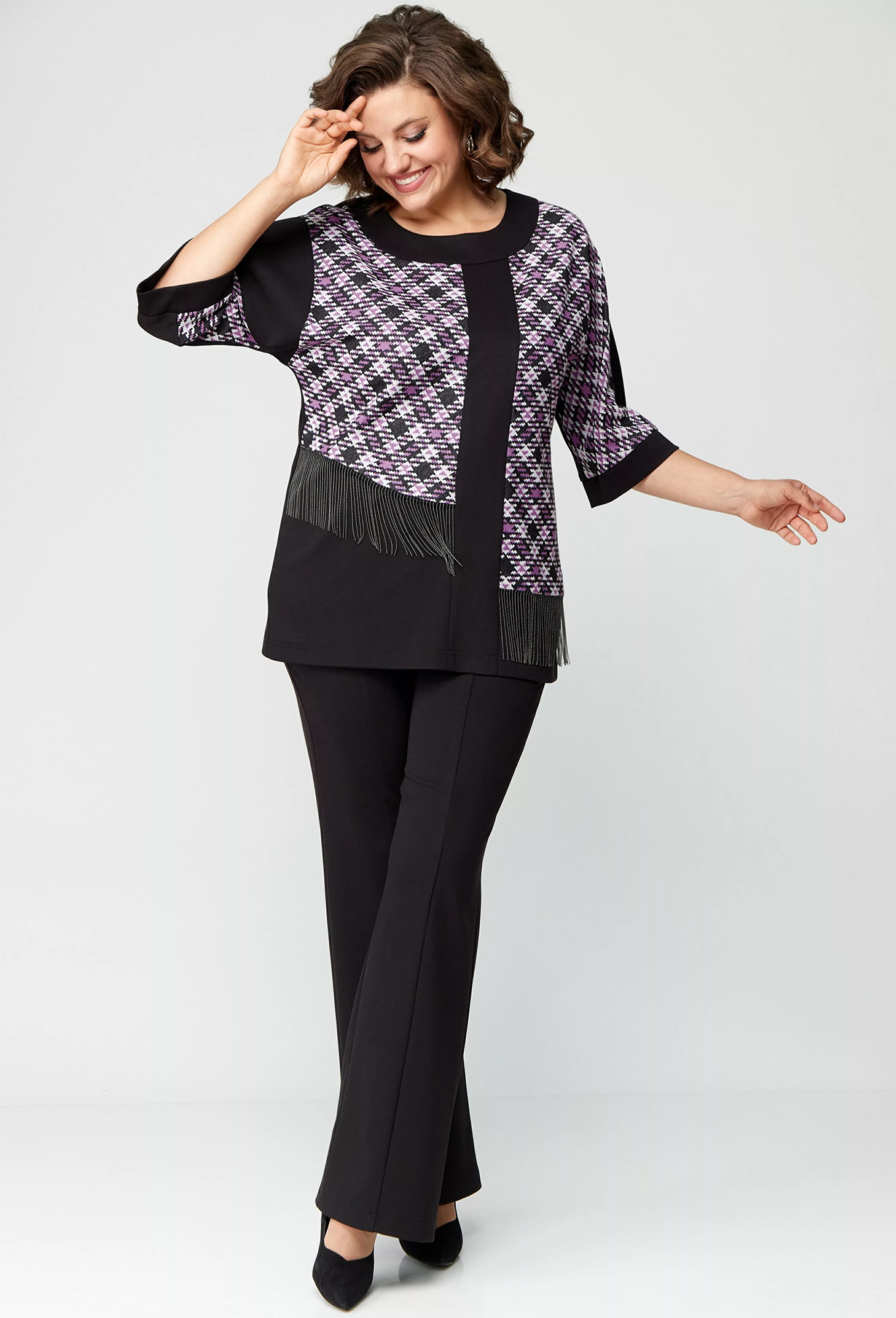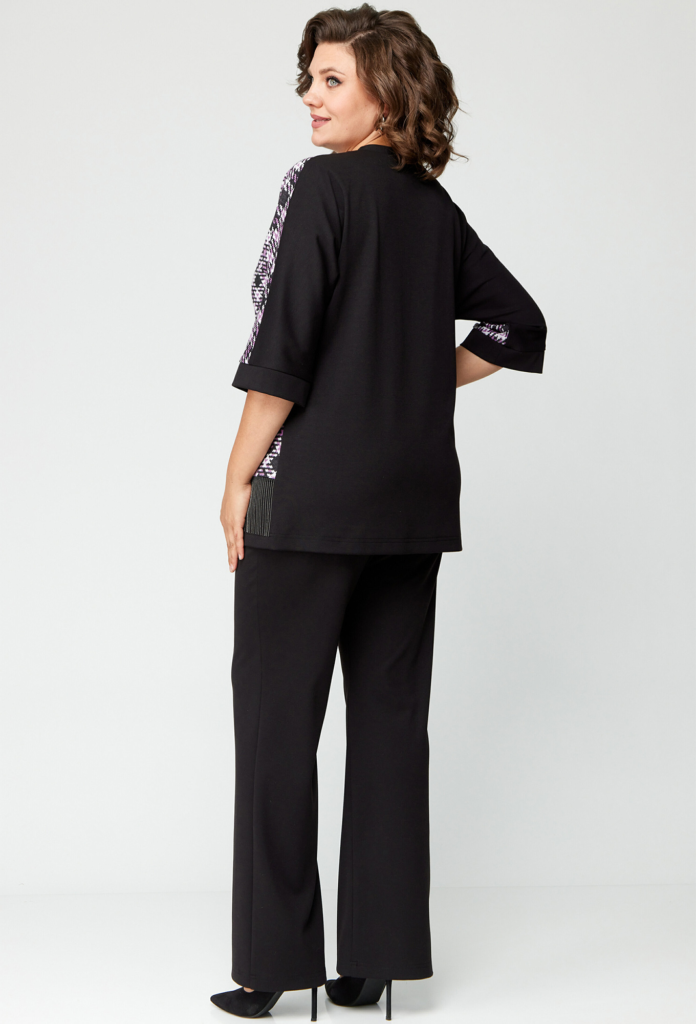Модель: Анастасия Мак 1134 лиловый ..показатьi>Рост: 164 см (девушка на фото ростом 170см) Сезон: Осень-Зима Тип ткани: 66% ПЭ, 32% вискоза, 2% спандексКостюм состоящий из джемпера и брюк выполнен из трикотажного полотна, в сочетании однотонного трикотажного полотна и пестротканого трикотажного полотна.