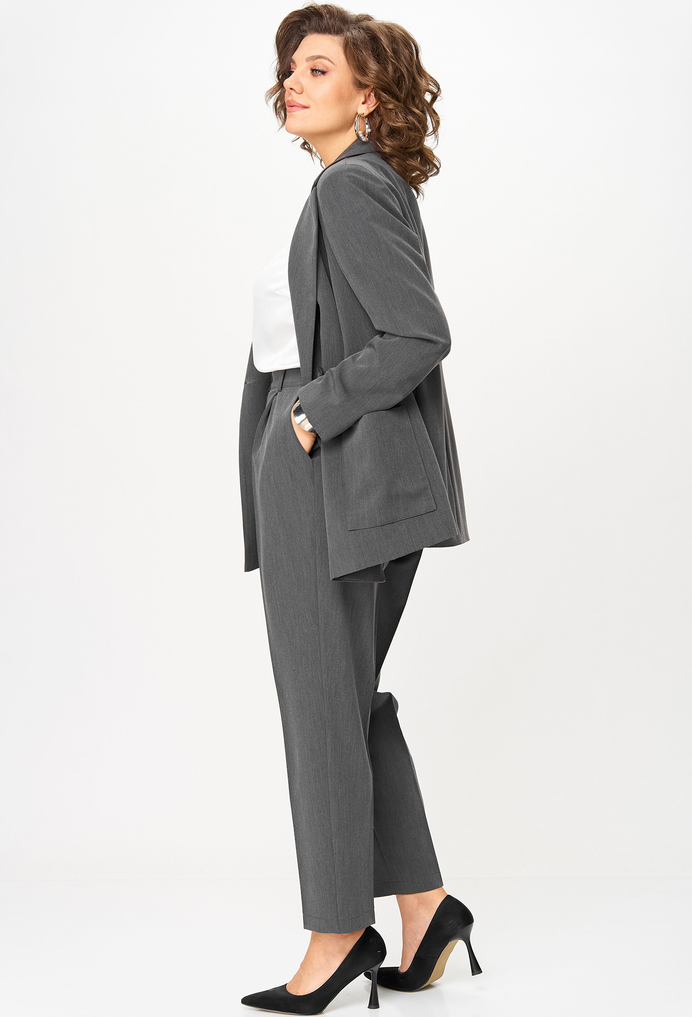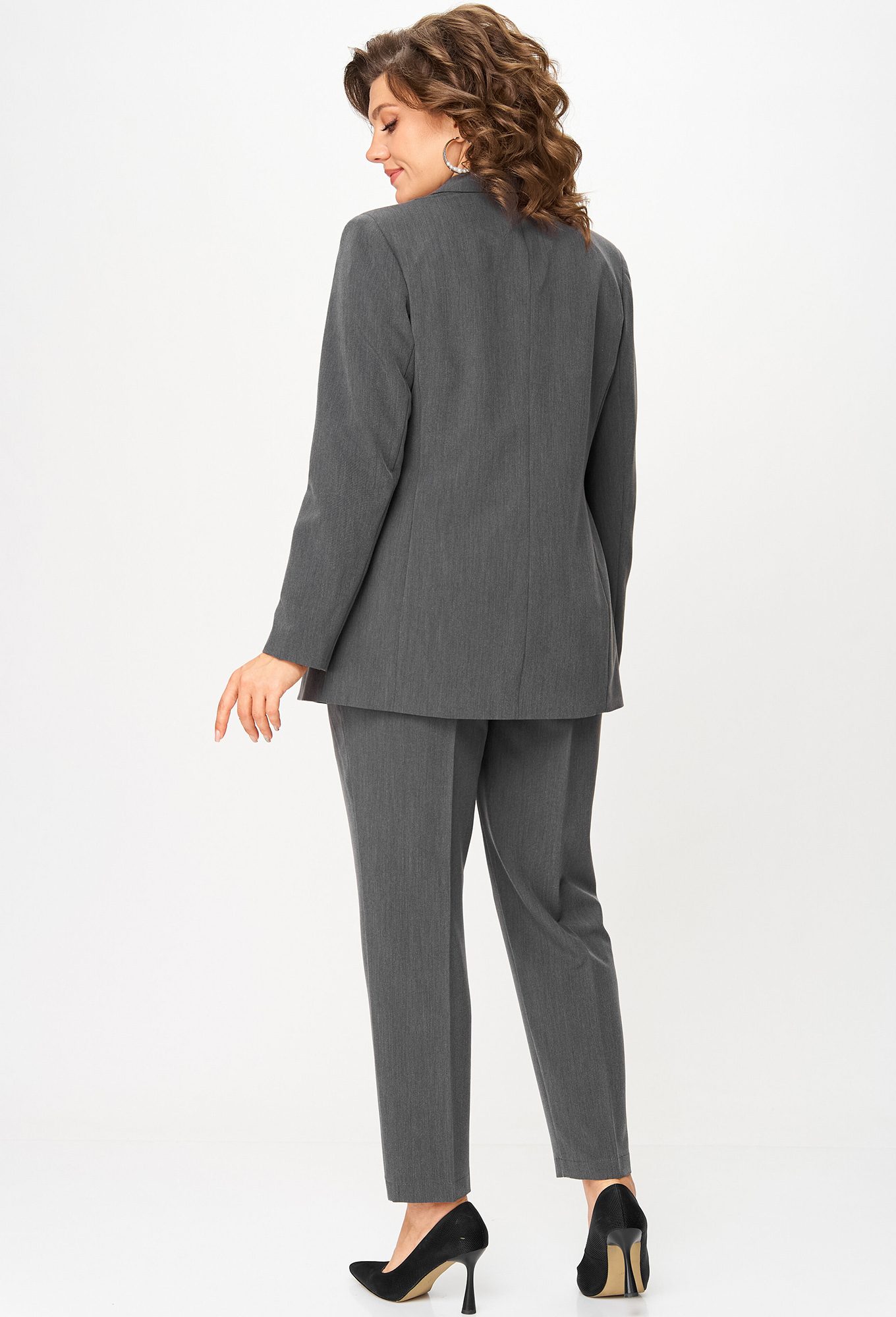 Модель: Анастасия Мак 1141А серый ..показать>Рост: 164 см (девушка на фото ростом 170см) Сезон: Круглогодичный Тип ткани: 75% Полиэстер, 20% вискоза, 5% спандексКостюм состоит из жакета и брюк. Костюм выполнен из однотонной ткани. Жакет прямого силуэта, на подкладке. Полочка жакета с вертикальными рельефами и двубортной застежкой на две пуговицы. Горловина V-образной формы. На нижней части полочки выполнены накладные карманы. Спинка со средним швом и отрезными бочками. Рукав длинный, втачной, двухшовный. Брюки со стрелками, зауженные к низу. По передним половинкам выполнены наклонные карманы и складки по талии. По задним половинкам обработаны талиевые вытачки. В среднем шве передней половинки брюк обработана застежка на молнию. Брюки на притачном поясе с эластичной тесьмой и застежкой на петлю и пуговицу.