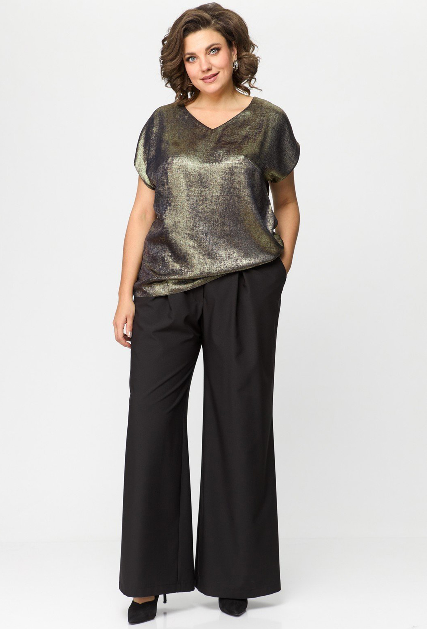 Брюки формы “палаццо”. По передней половинке выполнены наклонные карманы и по линии талии обработаны встречные складки. В среднем шве обработана застежка на молнию. По задним половинкам обработаны талиевые вытачки. Брюки на притачном поясе с эластичной тесьмой и застежкой на петлю и пуговицу.