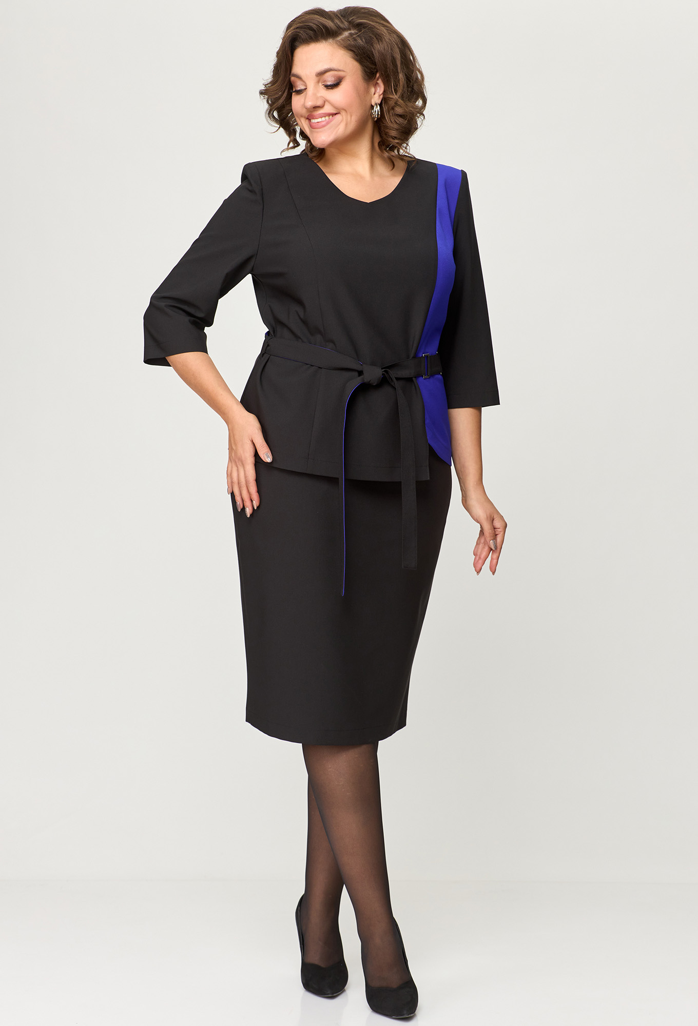 Модель: Анастасия Мак 1151 черный-василек<..показать/li> Рост: 164 см (девушка на фото ростом 170см) Сезон: Круглогодичный Тип ткани: 74% ПЭ, 24% вискоза, 2% спандексКостюм состоящий из блузки и юбки выполнен из однотонной ткани в двух контрастных цветах._x000D_