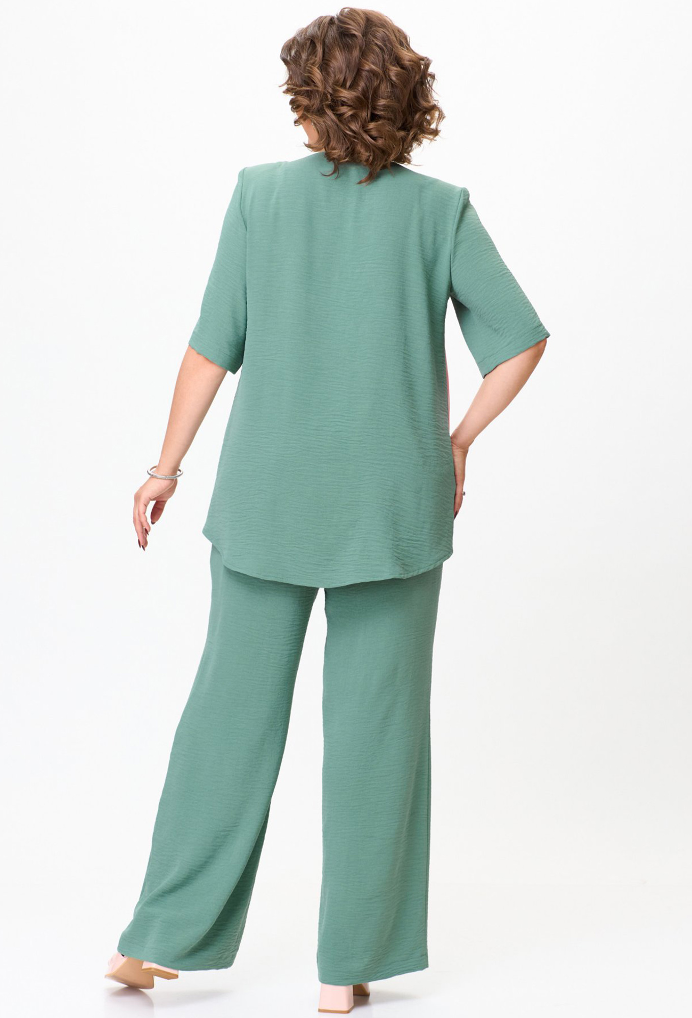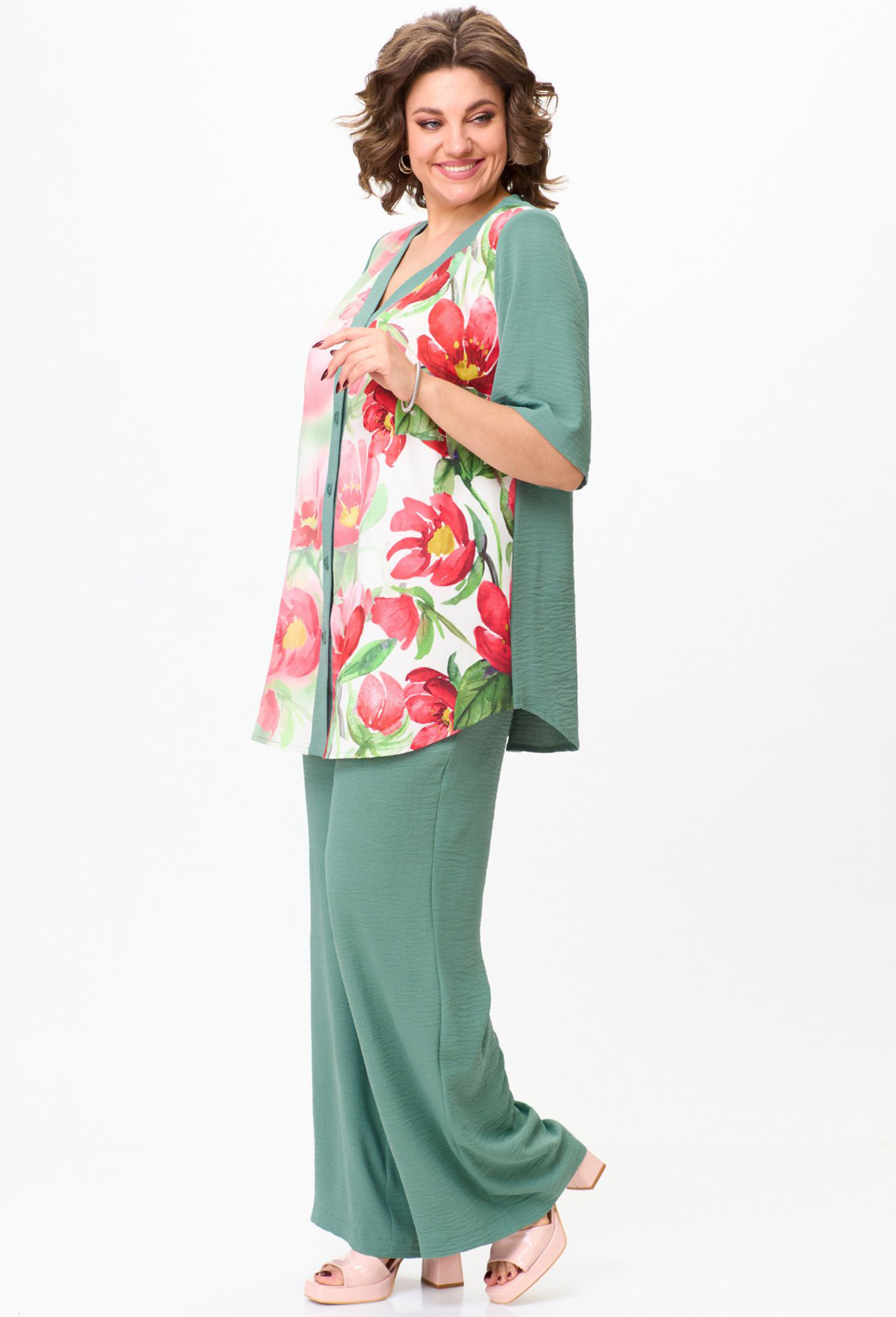 Модель: Анастасия Мак 1161 зеленый цветы..показатьli> Рост: 164 см (девушка на фото ростом 170см) Сезон: Весна-Лето Тип ткани: 100% ПЭКостюм состоящий из блузки и брюк, выполнен из однотонной ткани, в качестве отделки использована ткань с набивным рисунком.