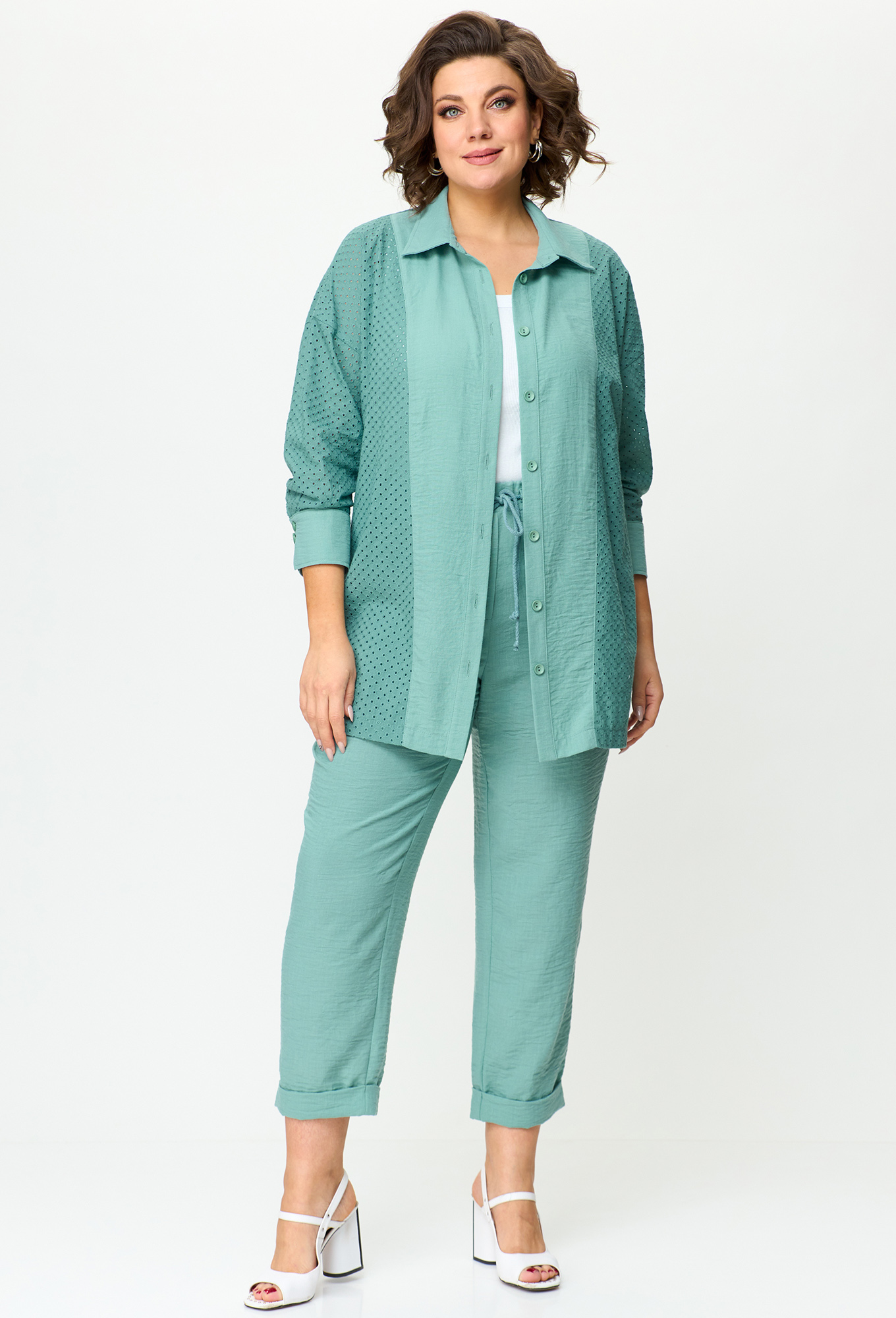 Модель: Анастасия Мак 1183 мятный ..показать>Рост: 164 см (девушка на фото ростом 170см) Сезон: Весна-Лето Тип ткани: 100% ПолиэстерКостюм состоящий из рубашки и брюк выполнен из однотонной ткани, в качестве отделки использована ткань “ришелье”. Блузка прямого силуэта. Полочка блузки с вертикальными рельефами. Горловина круглой формы. Воротник рубашечного типа. Центр полочки с отрезными планками и застежкой на петли и пуговицы. Спинка цельная. Пройма углубленной формы. Рукав одношовный, длиной ¾, по низу обработан притачной манжетой._x000D_