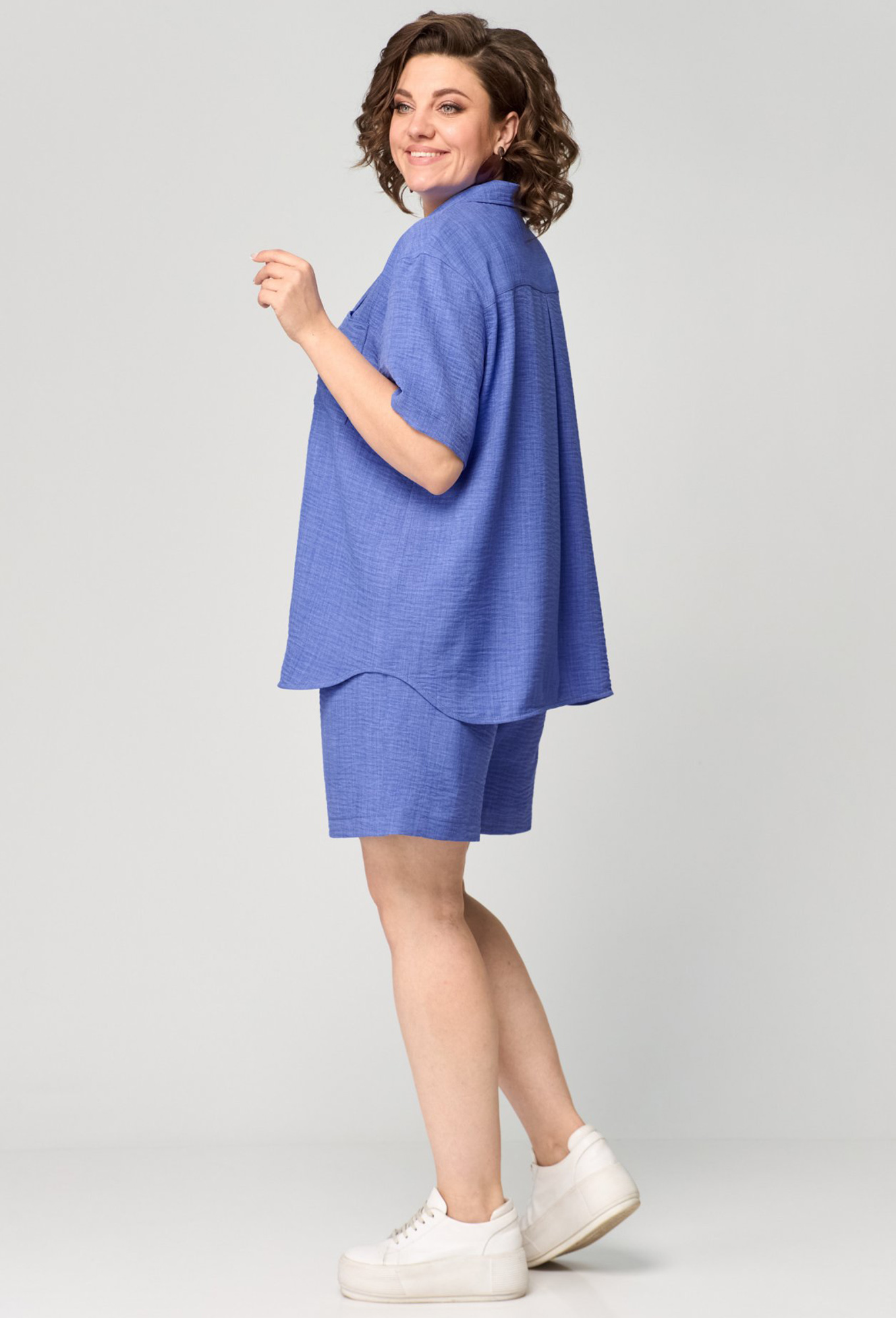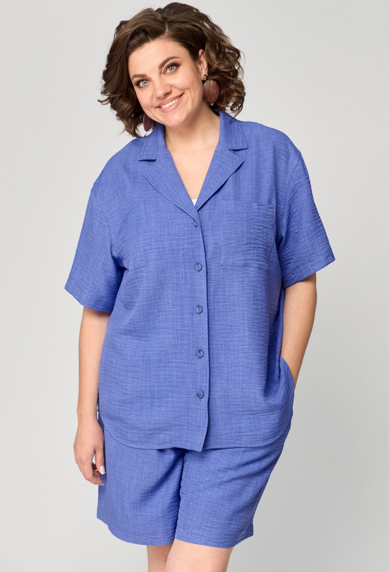 Модель: Анастасия Мак 1190 василек ..показатьi>Рост: 164 см (девушка на фото ростом 170см) Сезон: Весна-Лето Тип ткани: 100% ПЭКостюм состоящий из рубашки и шорт, выполнен из однотонной ткани._x000D_