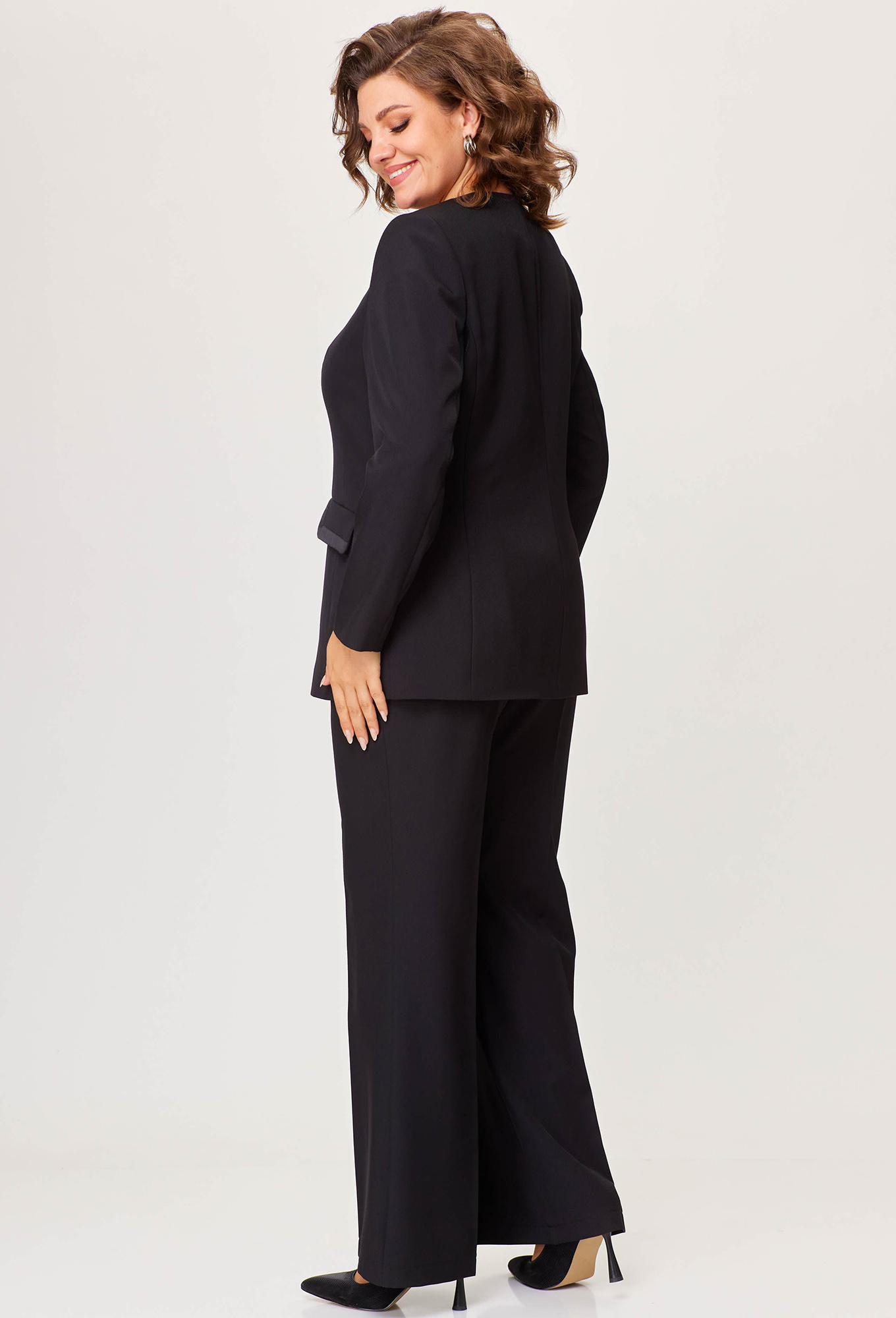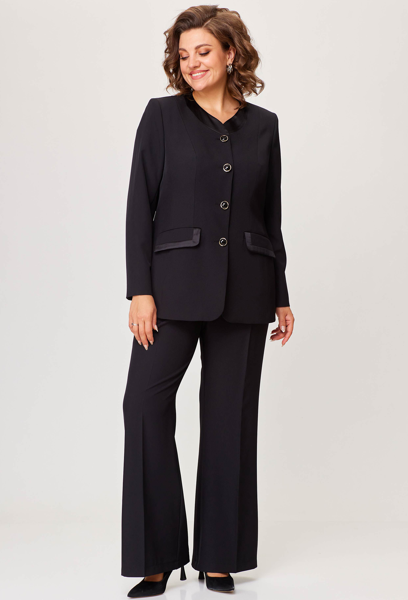 Модель: Анастасия Мак 1205 чёрный ..показать>Рост: 164 см (девушка на фото ростом 170см) Сезон: Круглогодичный Тип ткани: 74% полиэстер, 24% вискоза, 2% спандексКостюм состоящий из жакета и брюк выполнен из однотонной ткани, в качестве отделки использована ткань с атласным эффектом. Жакет на подкладке._x000D_