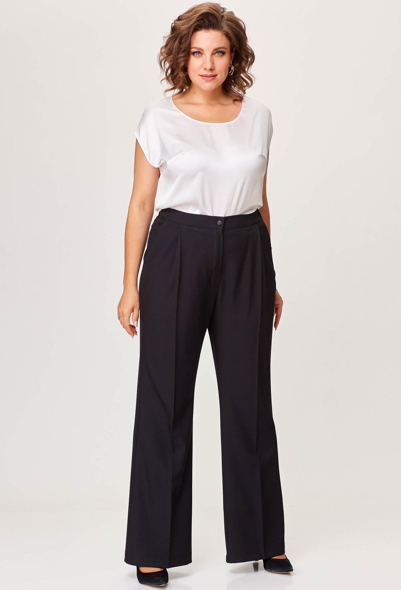 Брюки свободного силуэта, с легким расклешением штанин в нижней части. Передняя часть брюк с наклонными карманами и складками по линии талии. Задняя часть брюк с талиевыми вытачками. В среднем шве передней половинки обработана застежка на молнию. Брюки по талии на притачном поясе с эластичной тесьмой и застежкой на петлю и пуговицу.
