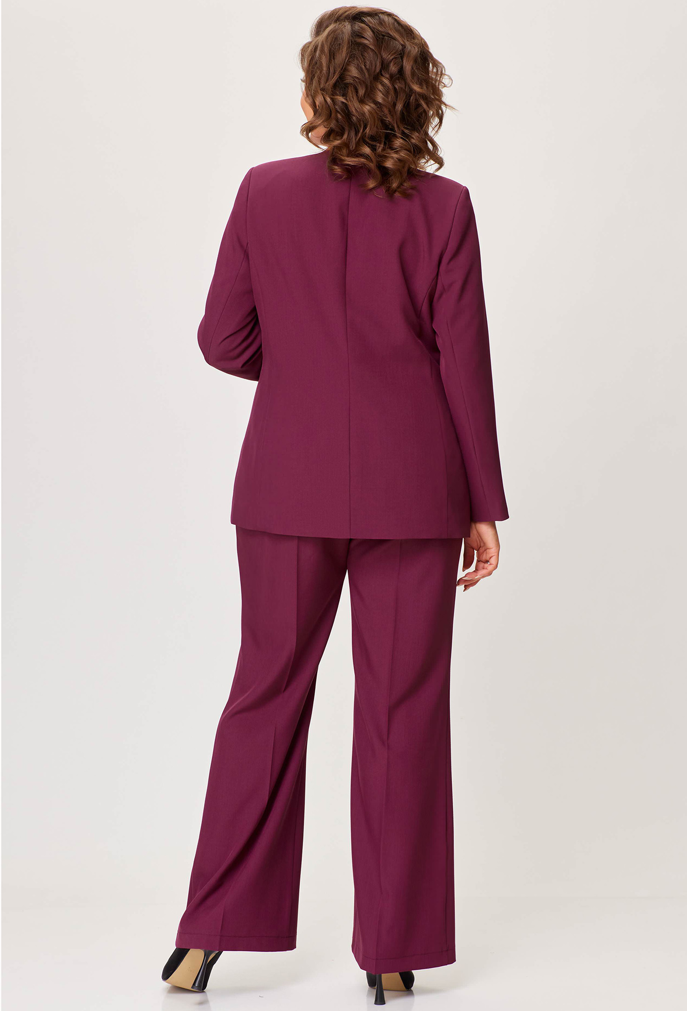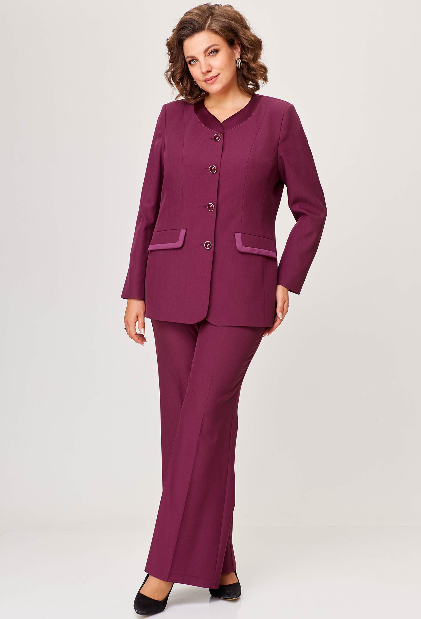 Модель: Анастасия Мак 1205 винный ..показать>Рост: 164 см (девушка на фото ростом 170см) Сезон: Круглогодичный Тип ткани: 74% полиэстер, 24% вискоза, 2% спандексКостюм состоящий из жакета и брюк выполнен из однотонной ткани, в качестве отделки использована ткань с атласным эффектом. Жакет на подкладке._x000D_