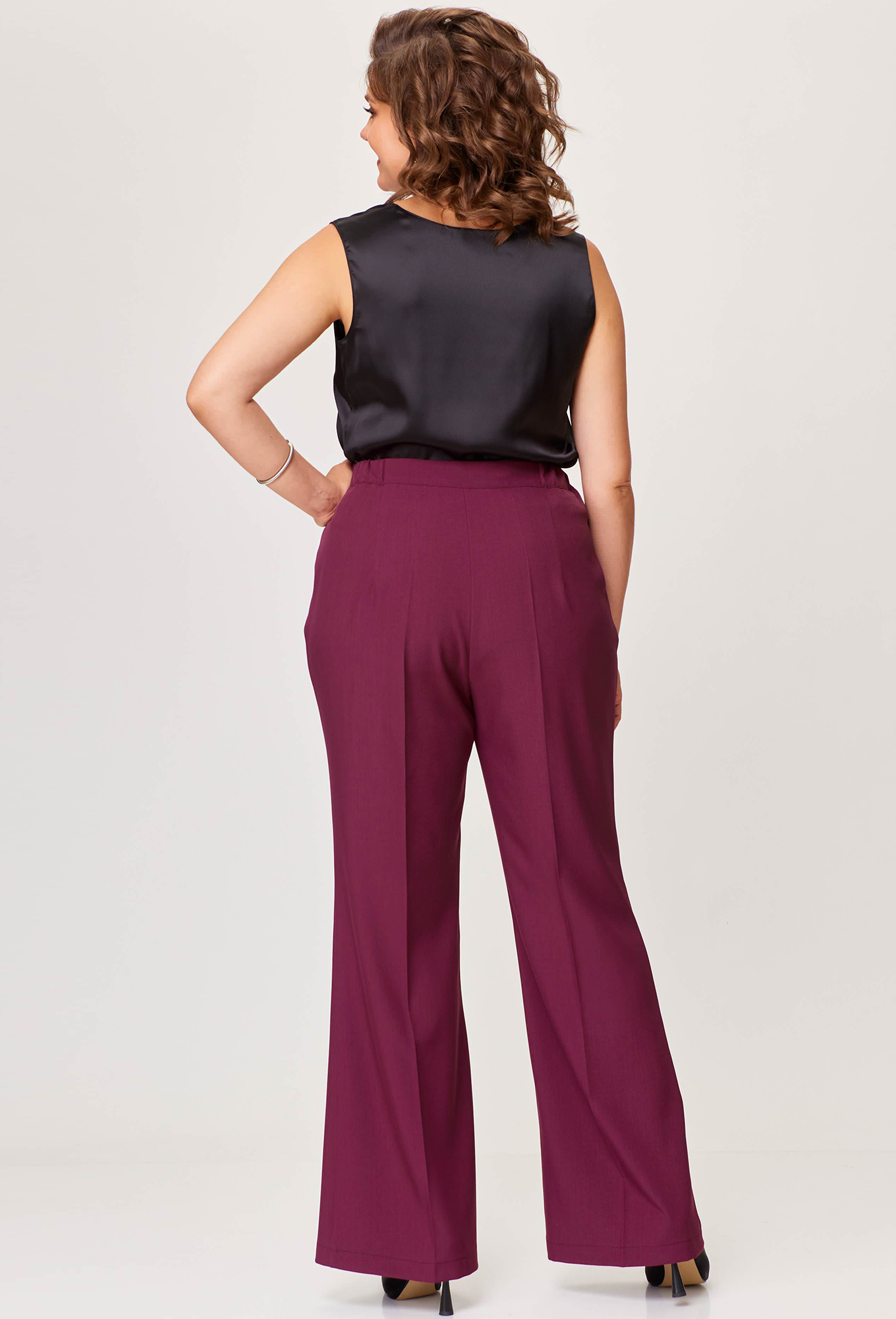 Брюки свободного силуэта, с легким расклешением штанин в нижней части. Передняя часть брюк с наклонными карманами и складками по линии талии. Задняя часть брюк с талиевыми вытачками. В среднем шве передней половинки обработана застежка на молнию. Брюки по талии на притачном поясе с эластичной тесьмой и застежкой на петлю и пуговицу.