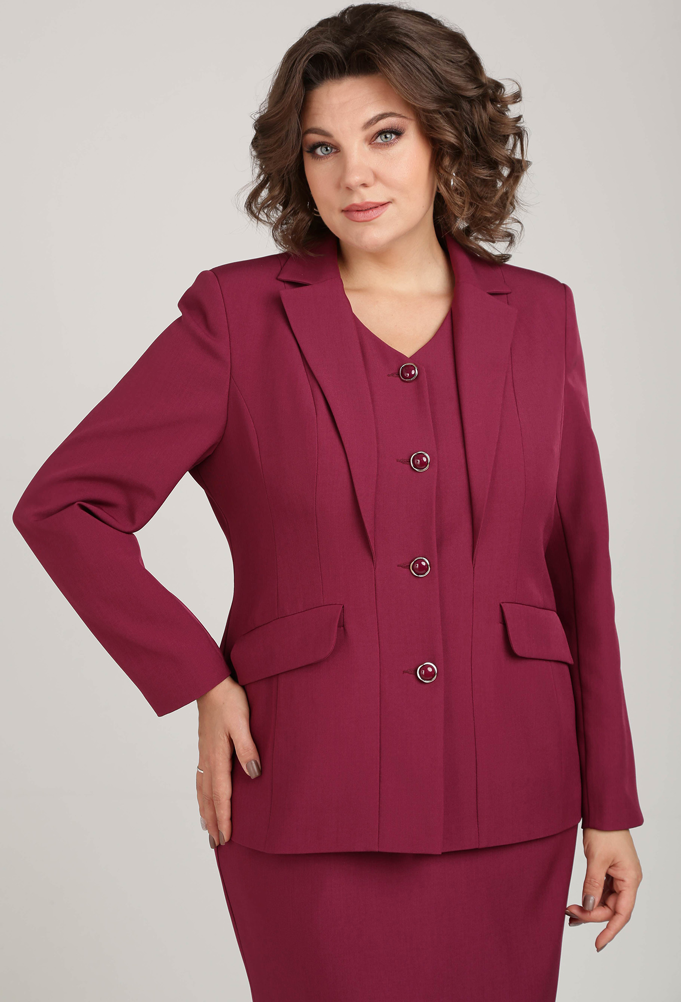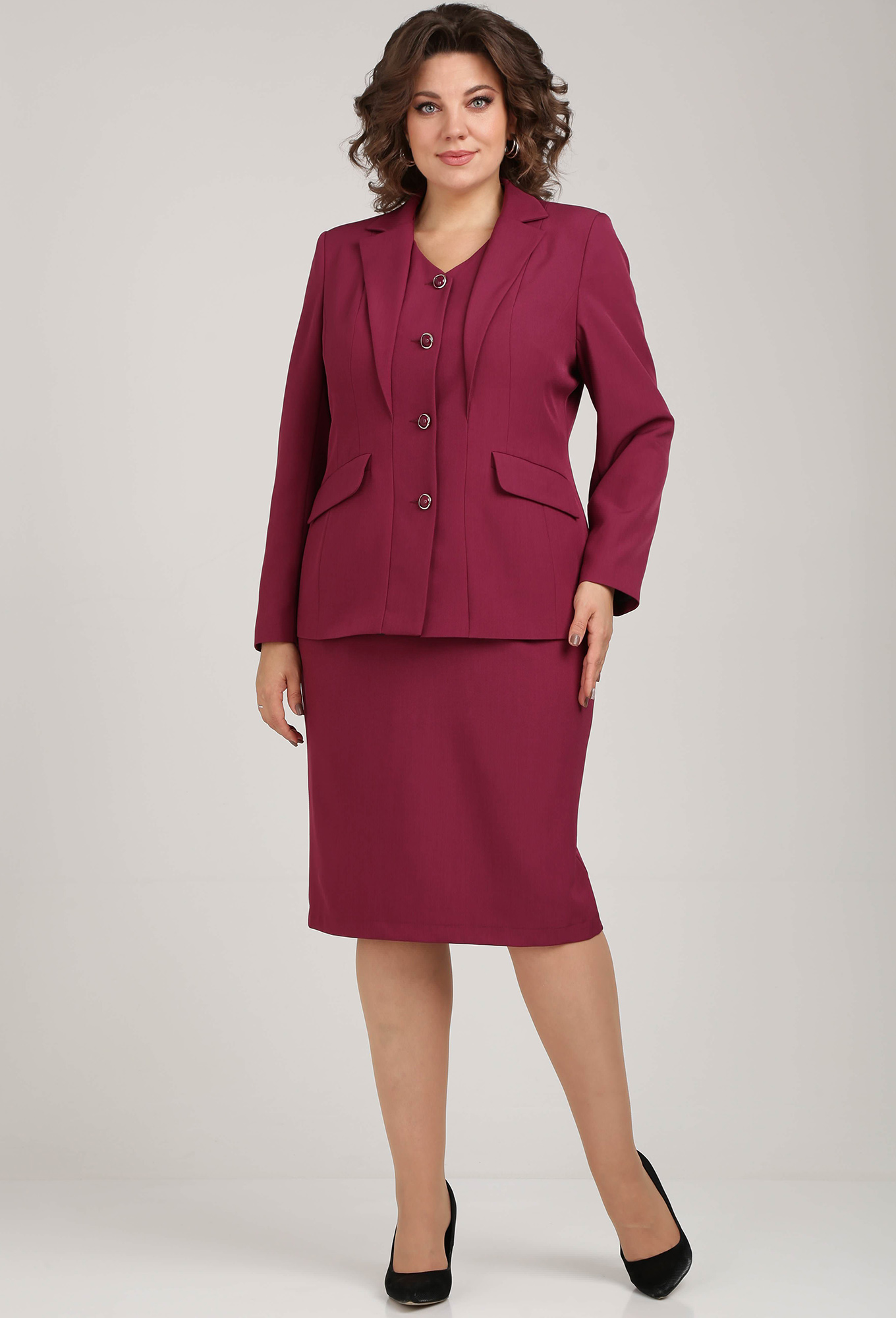 Модель: Анастасия Мак 1207 винный ..показать>Рост: 164 см (девушка на фото ростом 170см) Сезон: Круглогодичный Тип ткани: 100% ПолиэстерКостюм состоящий из жакета и юбки выполнен из однотонной ткани. Костюм на подкладке._x000D_