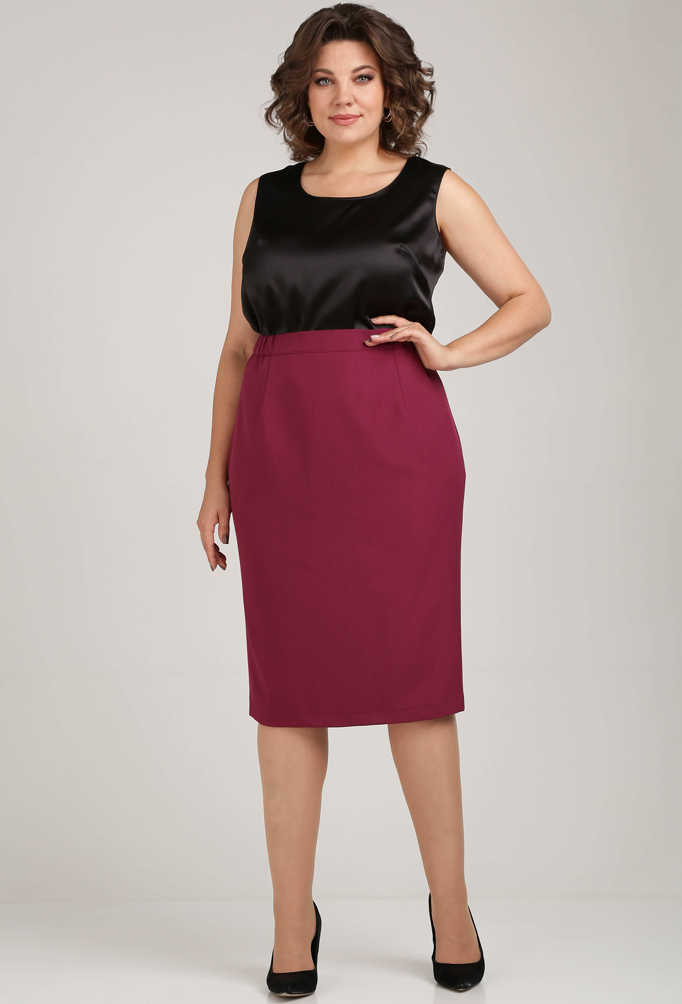 Юбка длиной за колено, зауженная к низу. Передняя часть юбки с талиевыми вытачками. Задняя часть юбки с талиевыми вытачками и средним швом в верхней части которого обработана потайная молния, в нижней части разрез. По талии юбка на притачном поясе с эластичной тесьмой и застежкой на петлю и пуговицу.