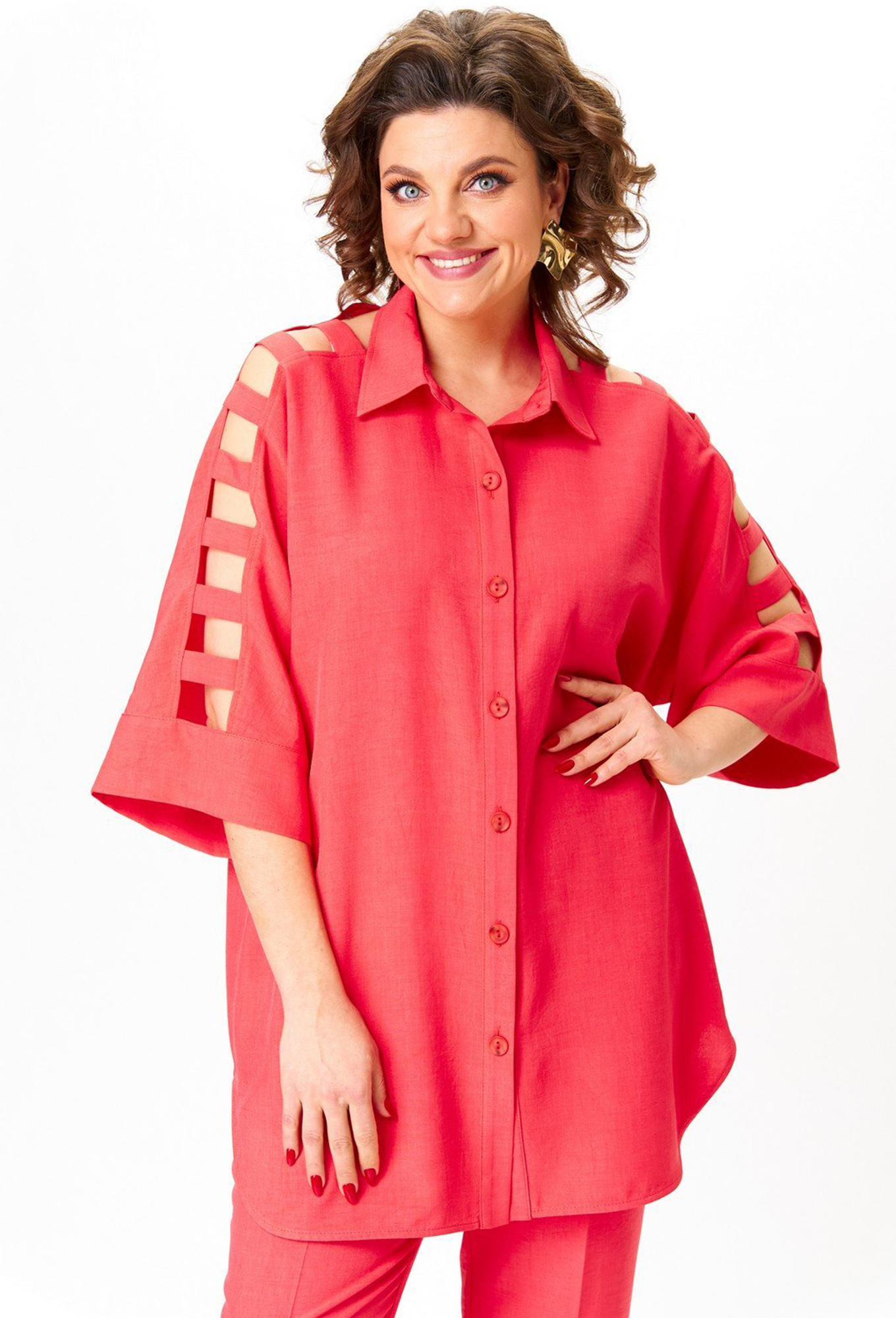 Блузка свободного прямого силуэта. Полочка с центральной застежкой на петли и пуговицы по притачной планке. Горловина круглой формы с воротником рубашечного типа. Спинка цельная. Рукав цельнокроеный, длиной ниже локтя. По низу рукав на притачной манжете. Зона плеча оформлена декором из планок. Низ блузки с закругленными краями в области боковых швов._x000D_