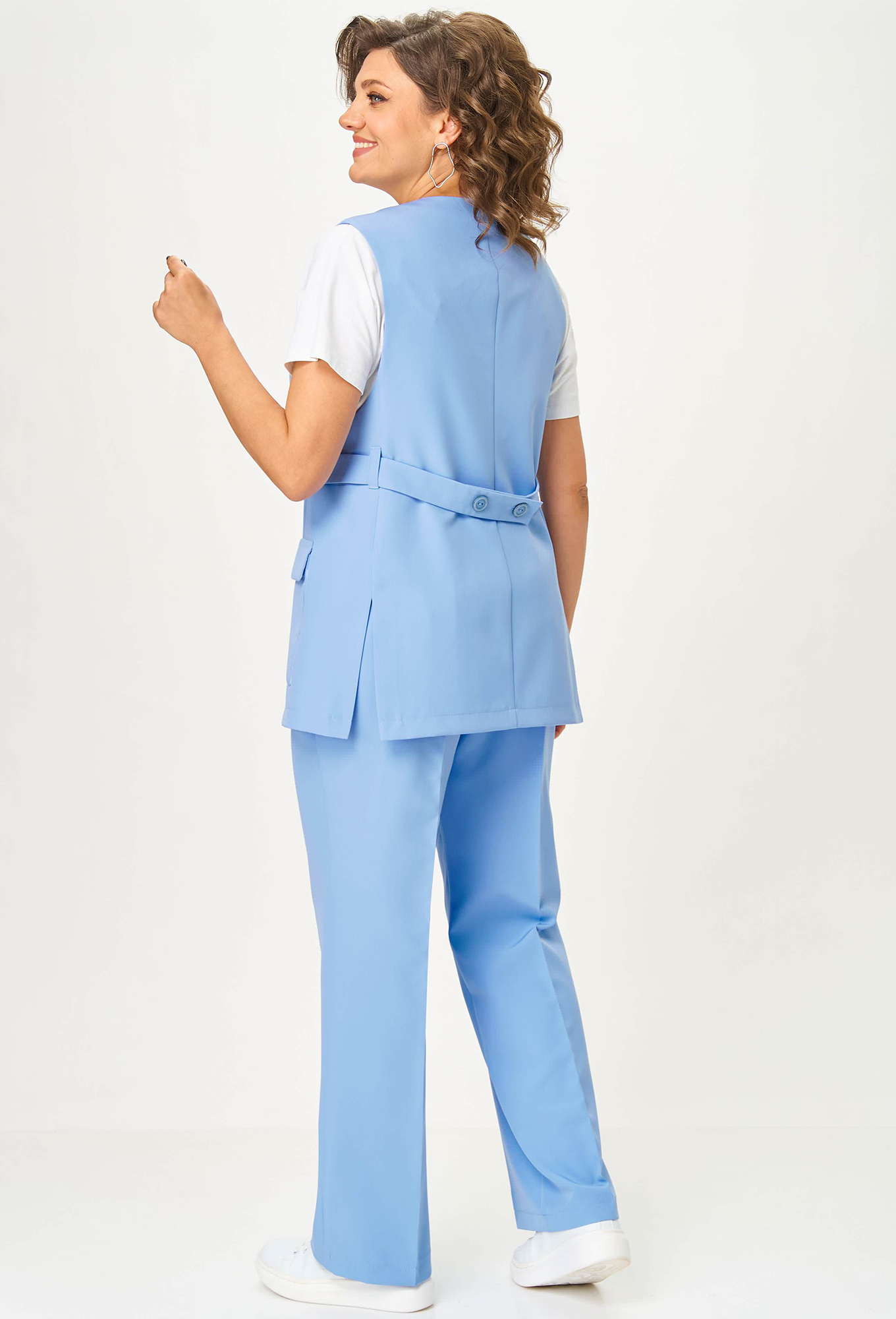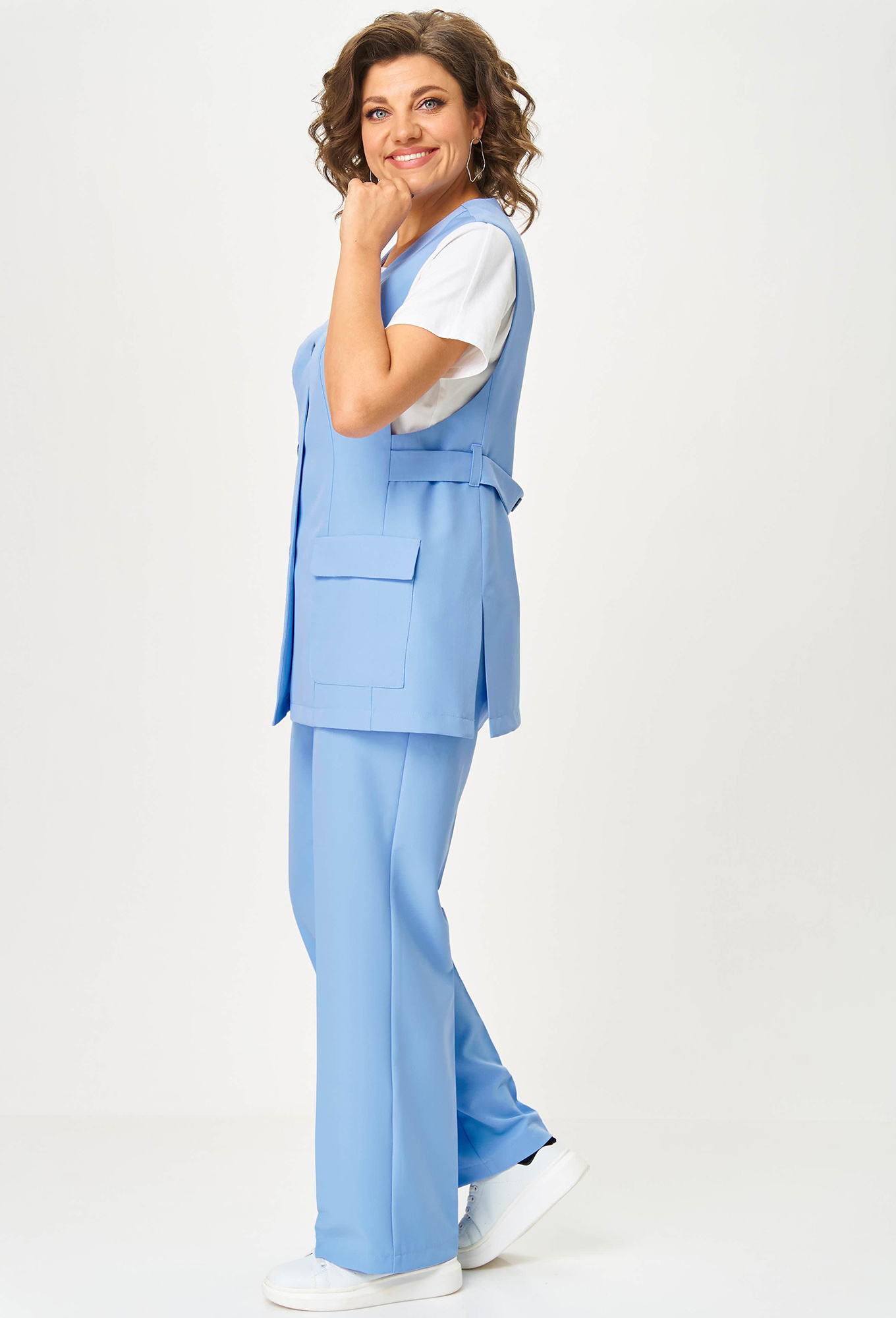 Модель: Анастасия Мак 1236 голубой ..показатьi>Рост: 164 см (девушка на фото ростом 170см) Сезон: Весна-Лето Тип ткани: 97% полиэстер, 3% спандексКостюм состоящий из жилета и брюк выполнен из однотонной ткани._x000D_