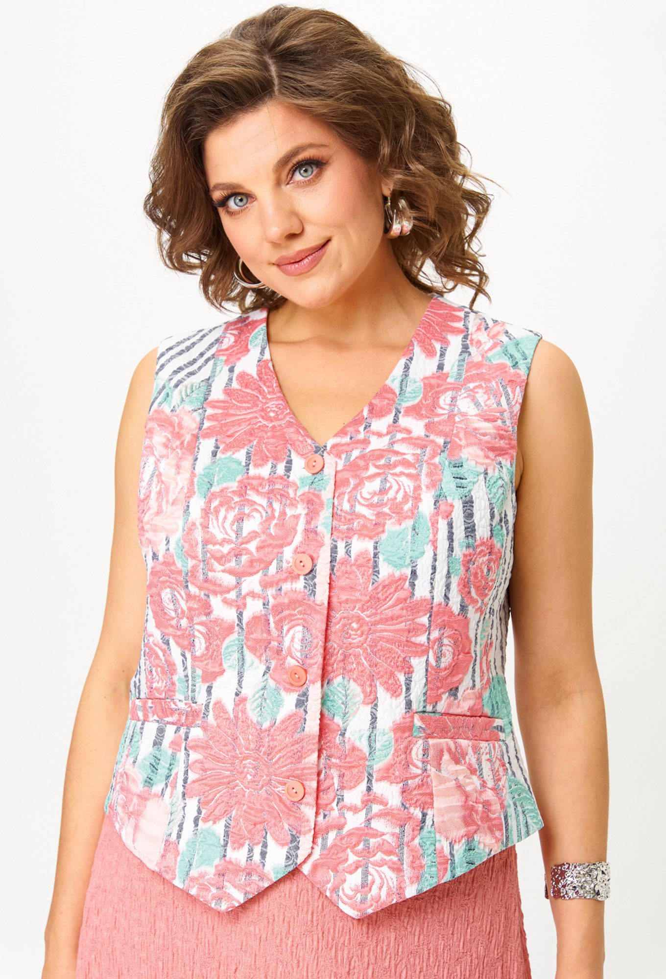 Жилет полуприлегающего силуэта, выполнен из жаккардовой купонной ткани. Полочка жилета с вертикальными рельефами и прорезным карманом с листочкой. Горловина V-образной формы. Спинка со средним швом и вертикальными рельефами._x000D_