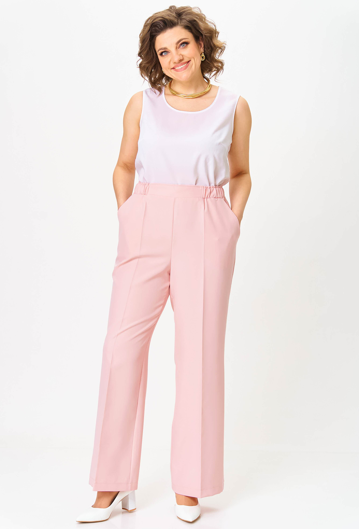 Брюки в области бедер полуприлегающие, в области колена и по низу свободные. В верхней части передних половинок обработаны наклонные карманы. На задней части обработаны талиевые вытачки. Брюки со стрелками. Пояс притачной с эластичной тесьмой, проходящей от стрелки по правой передней половинке, через боковой, по задней половинке и до стрелки по левой передней половинке.