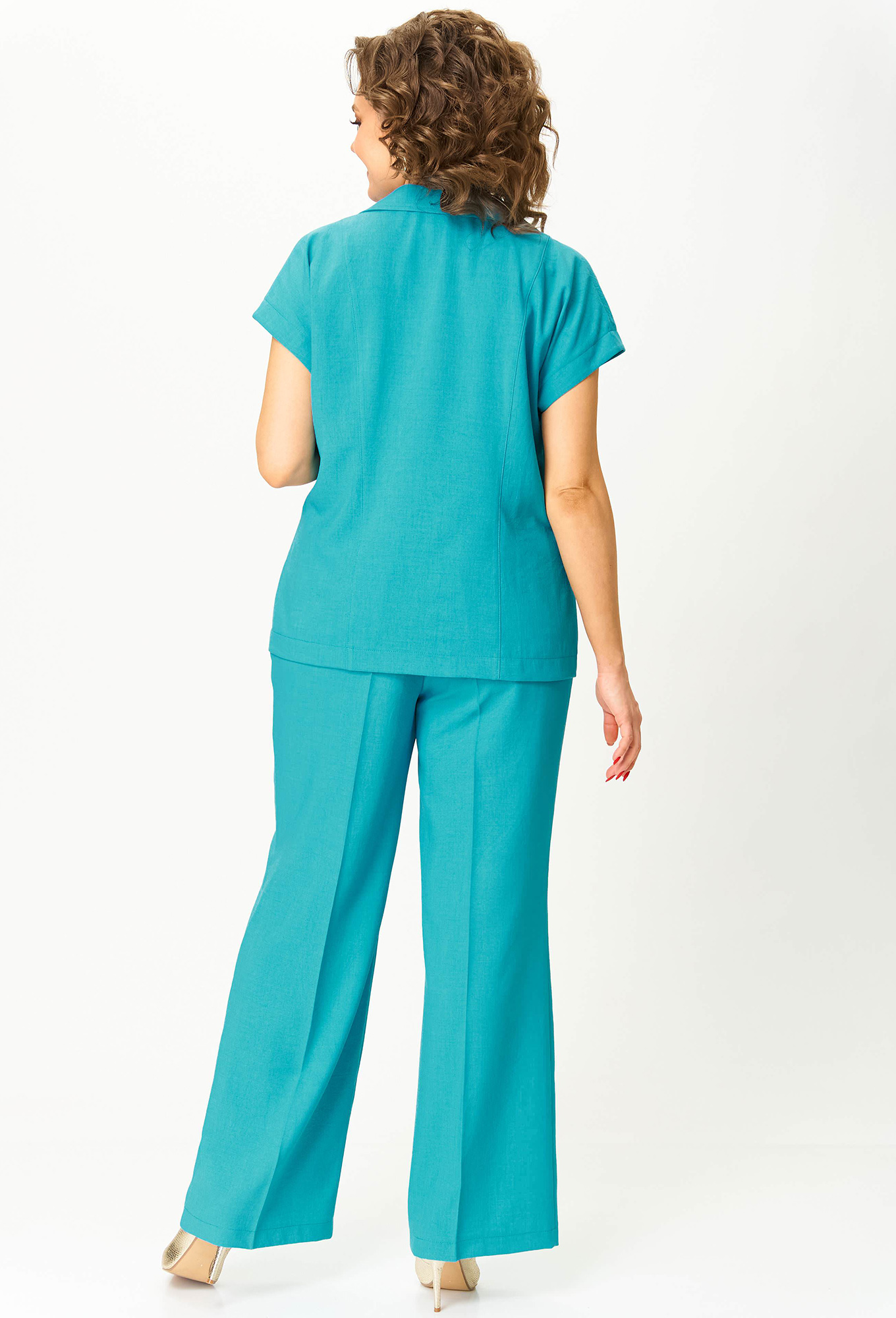Модель: Анастасия Мак 1258 лазурный <..показатьli>Рост: 164 см (девушка на фото ростом 170см) Сезон: Весна-Лето Тип ткани: 100% ПолиэстерКостюм состоит из жакета и брюк, выполнен из однотонной ткани. Жакет полуприлегающего силуэта, длиной чуть ниже линии бедер. Жакет с застежками на один ряд петель и пуговиц, и воротником притачного типа. Полочка и спинка с рельефами от плечевого шва. Рукав цельнокроеный, короткий. Брюки прямые, длинные, свободные в верхней части, со стрелками. По передним половинам выполнены карманы. Брюки на притачном поясе с эластичной тесьмой.