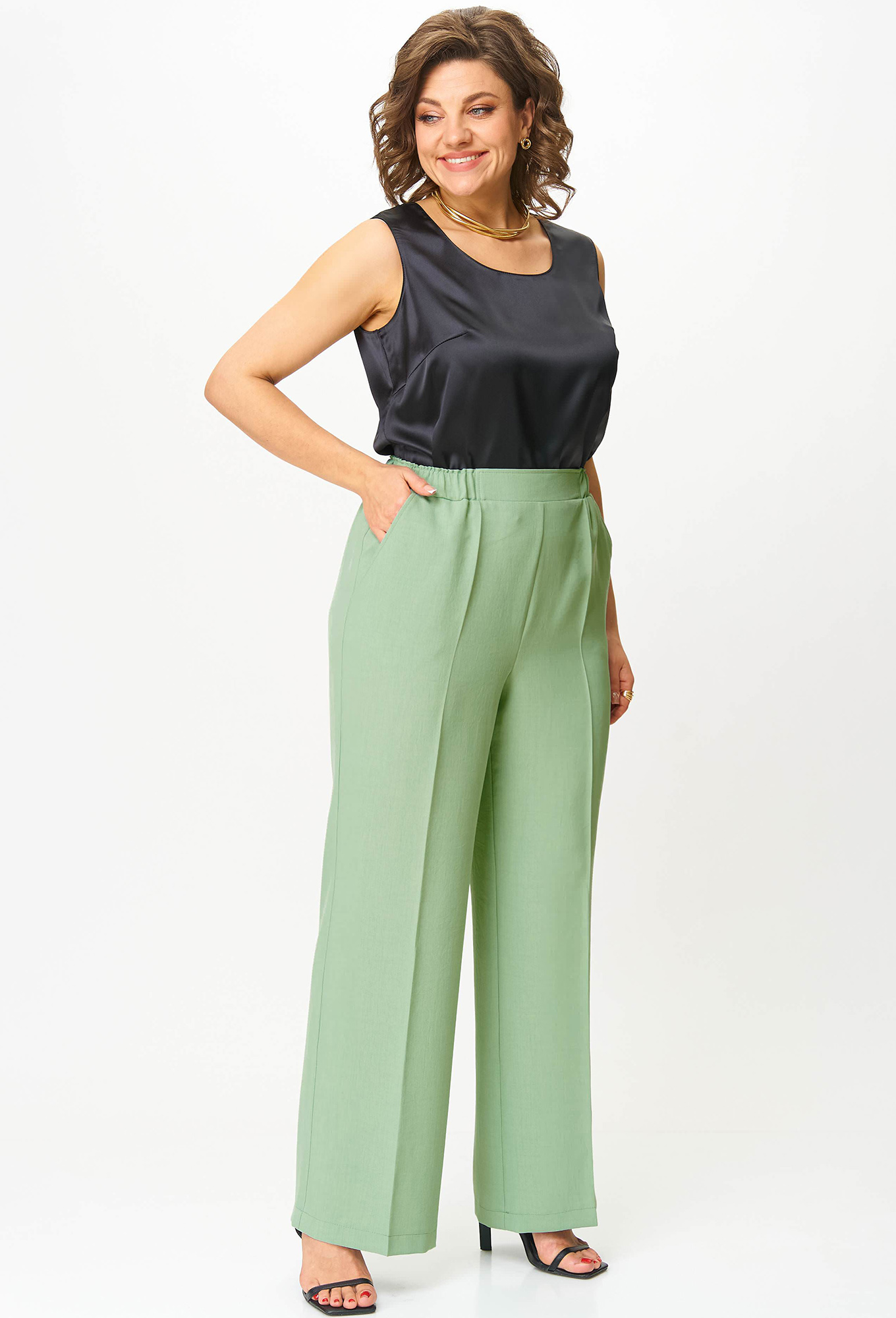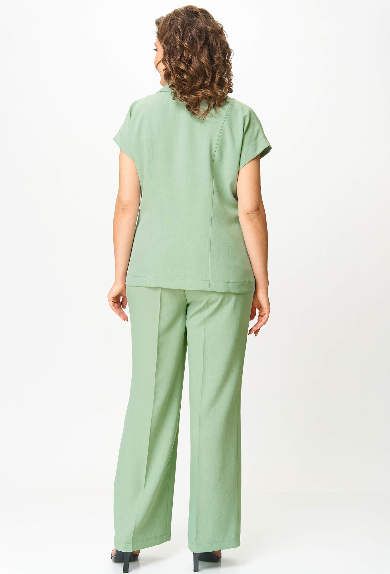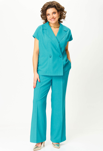 Модель: Анастасия Мак 1258 мята Р..показатьост: 164 см (девушка на фото ростом 170см) Сезон: Весна-Лето Тип ткани: 100% ПолиэстерКостюм состоит из жакета и брюк, выполнен из однотонной ткани. Жакет полуприлегающего силуэта, длиной чуть ниже линии бедер. Жакет с застежками на один ряд петель и пуговиц, и воротником притачного типа. Полочка и спинка с рельефами от плечевого шва. Рукав цельнокроеный, короткий. Брюки прямые, длинные, свободные в верхней части, со стрелками. По передним половинам выполнены карманы. Брюки на притачном поясе с эластичной тесьмой.