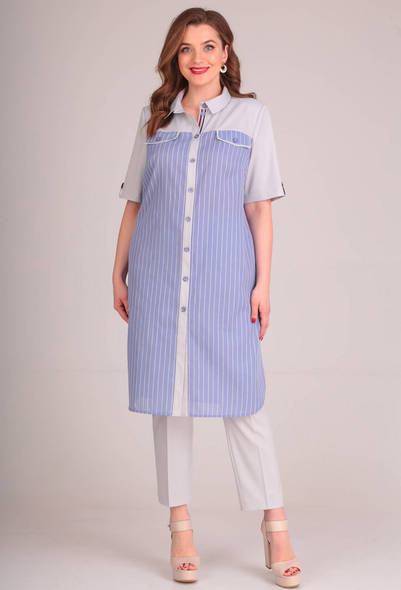 Модель: Анастасия Мак 608 голубой ..показать>Рост: 164 см (девушка на фото ростом 170см) Сезон: весна-лето Тип ткани: Туника- Хлопок-100%; Брюки- Вискоза-35%; ПЭ-60%; Лайкра-5%;Комплект состоит из туники и брюк. Туника прямого силуэта выполнена из ткани в полоску. В качестве отделки использована однотонная ткань. Туника длиной слегка за колено, полочка с центральной застежкой в виде притачной планки, на петли и пуговицы. По левой планке настрочена отделочная тесьма. В верхней части полочки выполнена плечевая кокетка с двойными декоративными планками. Спинка так же с отрезной кокеткой. Воротник рубашечного типа, стояче-отложной. Рукав втачной, одношовный, длиной до локтя. По низу рукава выполнен декоративный элемент из тесьмы, крепящейся пуговицей. Низ туники переходящий в разрез бокового шва оформлен плавной, закругленной линией. Брюки выполнены из однотонной ткани, со стрелками, длиной до косточки. В верхней части, по бедрам брюки прилегающие, в колене свободные и заужены к низу. По низу по боковому шву выполнены маленькие разрезы. Передняя часть брюк с карманами и застежкой на молнию в среднем шве. По задним половинкам выполнены талиевые вытачки. Брюки на притачном поясе с эластичной тесьмой и застежкой на петлю и пуговицу.