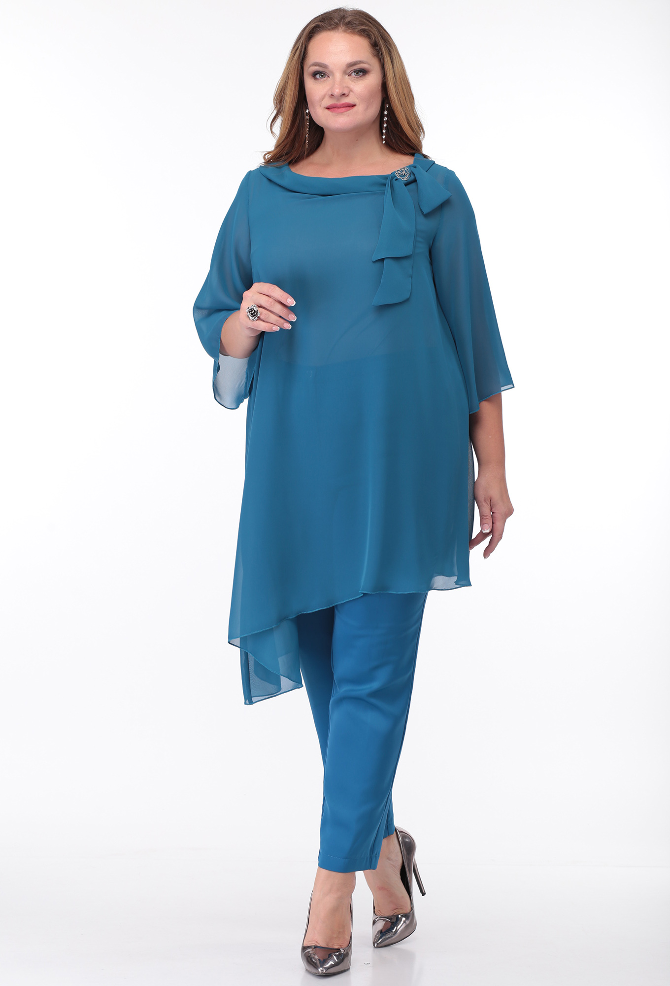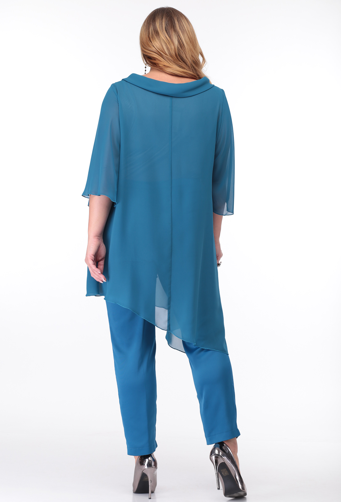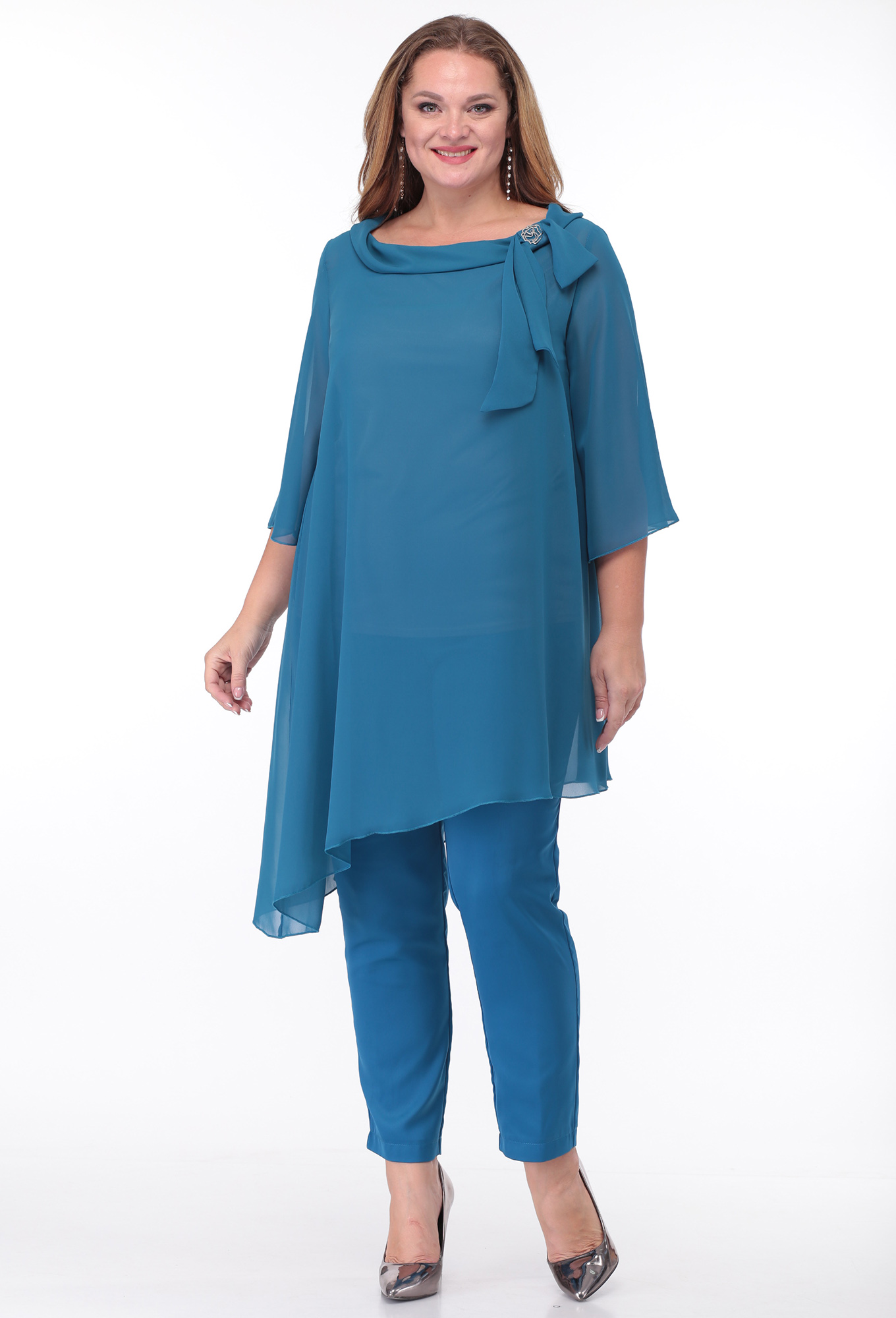 Модель: Анастасия Мак 660 голубой ..показать>Рост: 164 см (девушка на фото ростом 170см) Сезон: круглогодичный Тип ткани: Шифон - 100% Полиэстер;Блуза - 96% Полиэстер, 4% Спандекс;Брюки - 90% Полиэстер, 10% СпандексКостюм состоит из блузки и брюк. Блузка выполнена из однотонного шифона, в качестве подкладки в блузе использовано однотонное трикотажное полотно. Брюки выполнены из однотонной ткани. Блузка А-образного силуэта, с асимметричным низом. Горловина овальной формы, обработана воротником-планкой, спереди по левой части горловины декор из шифона и броши. Спинка со средним швом . Рукав одношовный, втачной, длиной 3/4 , расширенный по низу. Нижняя часть блузки - подкладка в виде майки. Полочка майки с нагрудными вытачками, спинка цельная. Брюки со стрелками. В области бедер брюки прилегающие, свободные в колене и зауженные книзу. По передним половинкам обработаны карманы и в среднем шве застёжка на молнию. По задним половинкам талиевые вытачки. Брюки на притачном поясе с эластичной тесьмой и застёжкой на петлю и пуговицу.