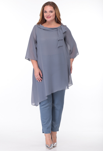 Модель: Анастасия Мак 660 серый Р..показатьост: 164 см (девушка на фото ростом 170см) Сезон: круглогодичный Тип ткани: Шифон - 100% Полиэстер;Блуза - 96% Полиэстер, 4% Спандекс;Брюки - 90% Полиэстер, 10% СпандексКостюм состоит из блузки и брюк. Блузка выполнена из однотонного шифона, в качестве подкладки в блузе использовано однотонное трикотажное полотно. Брюки выполнены из однотонной ткани. Блузка А-образного силуэта, с асимметричным низом. Горловина овальной формы, обработана воротником-планкой, спереди по левой части горловины декор из шифона и броши. Спинка со средним швом . Рукав одношовный, втачной, длиной 3/4 , расширенный по низу. Нижняя часть блузки - подкладка в виде майки. Полочка майки с нагрудными вытачками, спинка цельная. Брюки со стрелками. В области бедер брюки прилегающие, свободные в колене и зауженные книзу. По передним половинкам обработаны карманы и в среднем шве застёжка на молнию. По задним половинкам талиевые вытачки. Брюки на притачном поясе с эластичной тесьмой и застёжкой на петлю и пуговицу.ост: 164 см (девушка на фото ростом 170см)