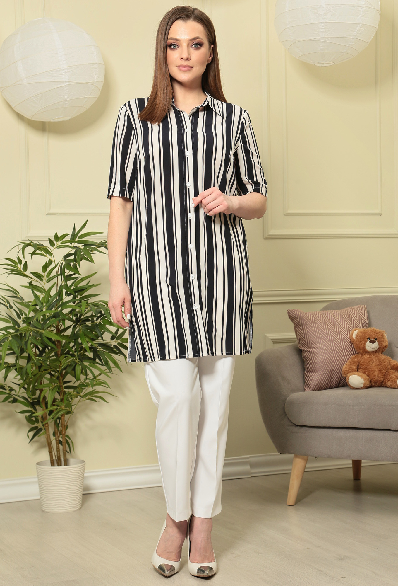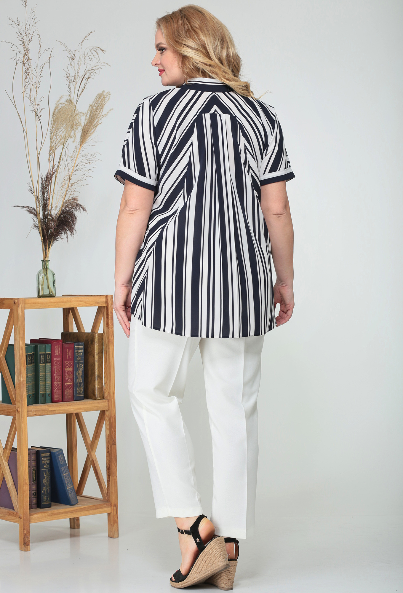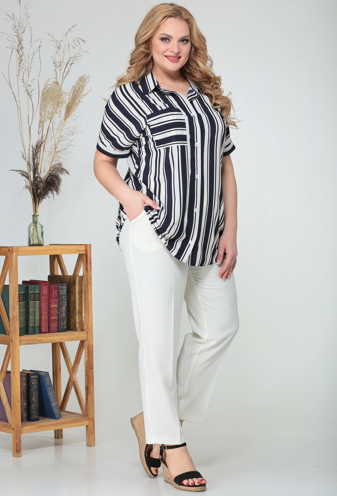 Модель: Анастасия Мак 708 синий полоска..показатьi> Рост: 164 см (девушка на фото ростом 170см) Сезон: весна-лето Тип ткани: 71% ПЭ, 24% Вискоза, 5% Спандекс; 90% ПЭ, 10% Вискоза.Костюм состоит из блузки и брюк. Блузка выполнена из ткани в полоску, брюки из однотонной ткани. Блузка прямого силуэта, длиной ниже линии бедер. Полочка с центральной застежкой на петли и пуговицы и нагрудной вытачкой. Горловина круглой формы, обработана притачным воротником рубашечного типа на стойке. Спинка цельная, в боковых швах от низа блузки обработаны разрезы. Рукав втачной, одношовный, короткий. Брюки длиной 7/8, области бедер прилегающие, в колене свободные и слегка зауженные к низу. Брюки со стрелками. По передним половинам обработаны карманы и застежка на молнию в среднем шве. Брюки на притачном поясе с эластичной тесьмой.i>