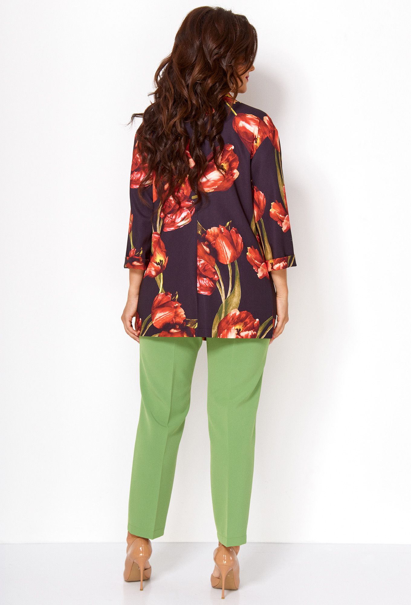 Модель: Анастасия Мак 739 зеленый ..показать>Рост: 164 см (девушка на фото ростом 170см) Сезон: весна-лето Тип ткани: 65% пэ, 32 %Вискоза, 3% Эластан; 62% Вискоза, 35% пэ, 3% Эластан.Костюм состоит из жакета и брюк. Жакет выполнен из ткани с набивным рисунком. Брюки выполнены из однотонной ткани. Жакет прямого силуэта, полочка с нагрудными вытачками, накладными карманами, входящими в боковой шов. Воротник пиджачного типа, стояче-отложной. Линия плеча спущена, рукав втачной, одношовный, длиной 3/4, по низу с манжетой. Спинка со средним швом. Брюки длиной 7/8, со стрелками, зауженные к низу.По передним половинам выполнены карманы, застежка в среднем шве на молнию. Брюки на притачной поясе с эластичной тесьмой и застежкой на петлю и пуговицу.Длина брюк по боковому шву с поясом 97-98 см.Длина спинки жакета 74-76 см.