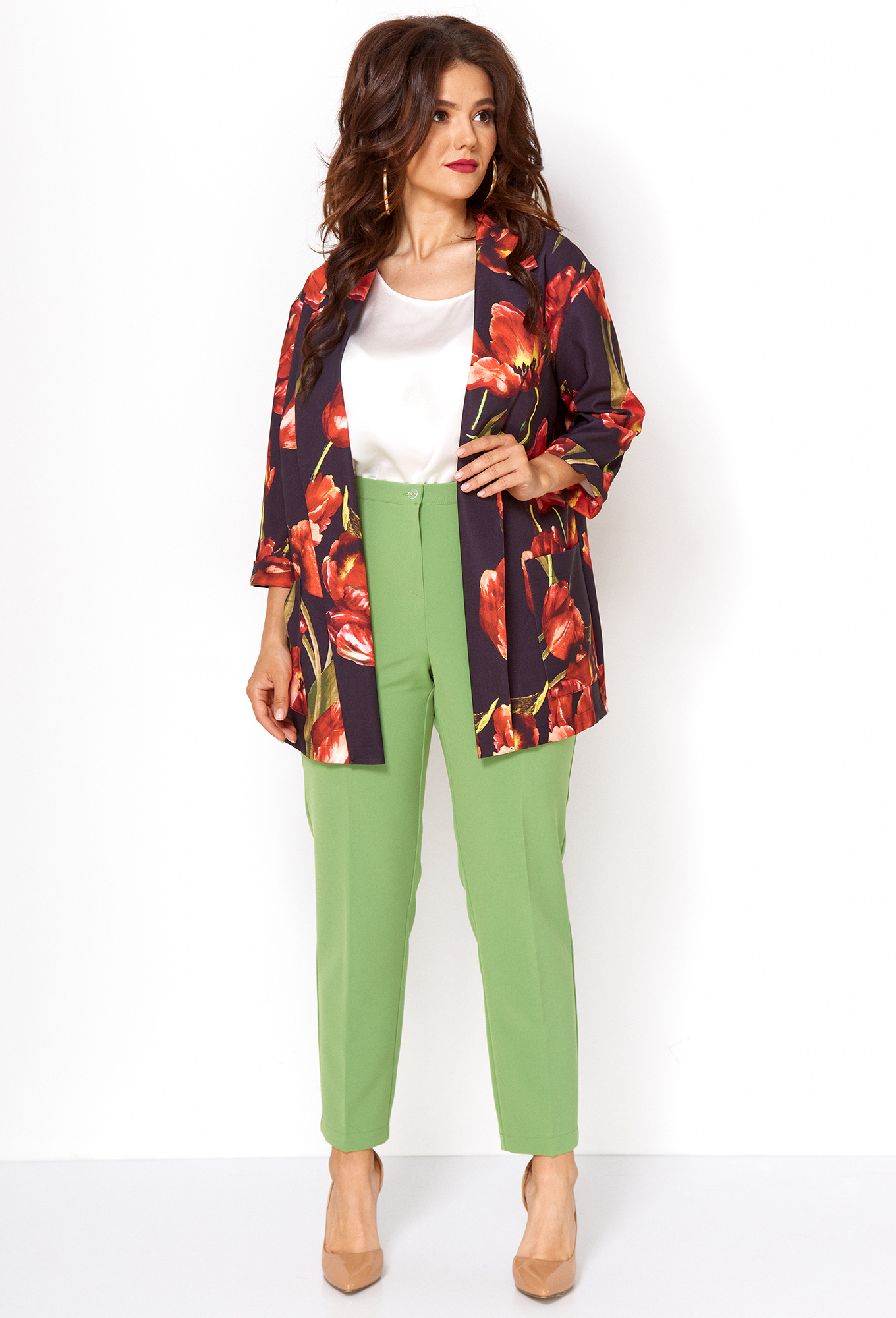 Модель: Анастасия Мак 739 зеленый ..показать>Рост: 164 см (девушка на фото ростом 170см) Сезон: весна-лето Тип ткани: 65% пэ, 32 %Вискоза, 3% Эластан; 62% Вискоза, 35% пэ, 3% Эластан.Костюм состоит из жакета и брюк. Жакет выполнен из ткани с набивным рисунком. Брюки выполнены из однотонной ткани. Жакет прямого силуэта, полочка с нагрудными вытачками, накладными карманами, входящими в боковой шов. Воротник пиджачного типа, стояче-отложной. Линия плеча спущена, рукав втачной, одношовный, длиной 3/4, по низу с манжетой. Спинка со средним швом. Брюки длиной 7/8, со стрелками, зауженные к низу.По передним половинам выполнены карманы, застежка в среднем шве на молнию. Брюки на притачной поясе с эластичной тесьмой и застежкой на петлю и пуговицу.Длина брюк по боковому шву с поясом 97-98 см.Длина спинки жакета 74-76 см.
