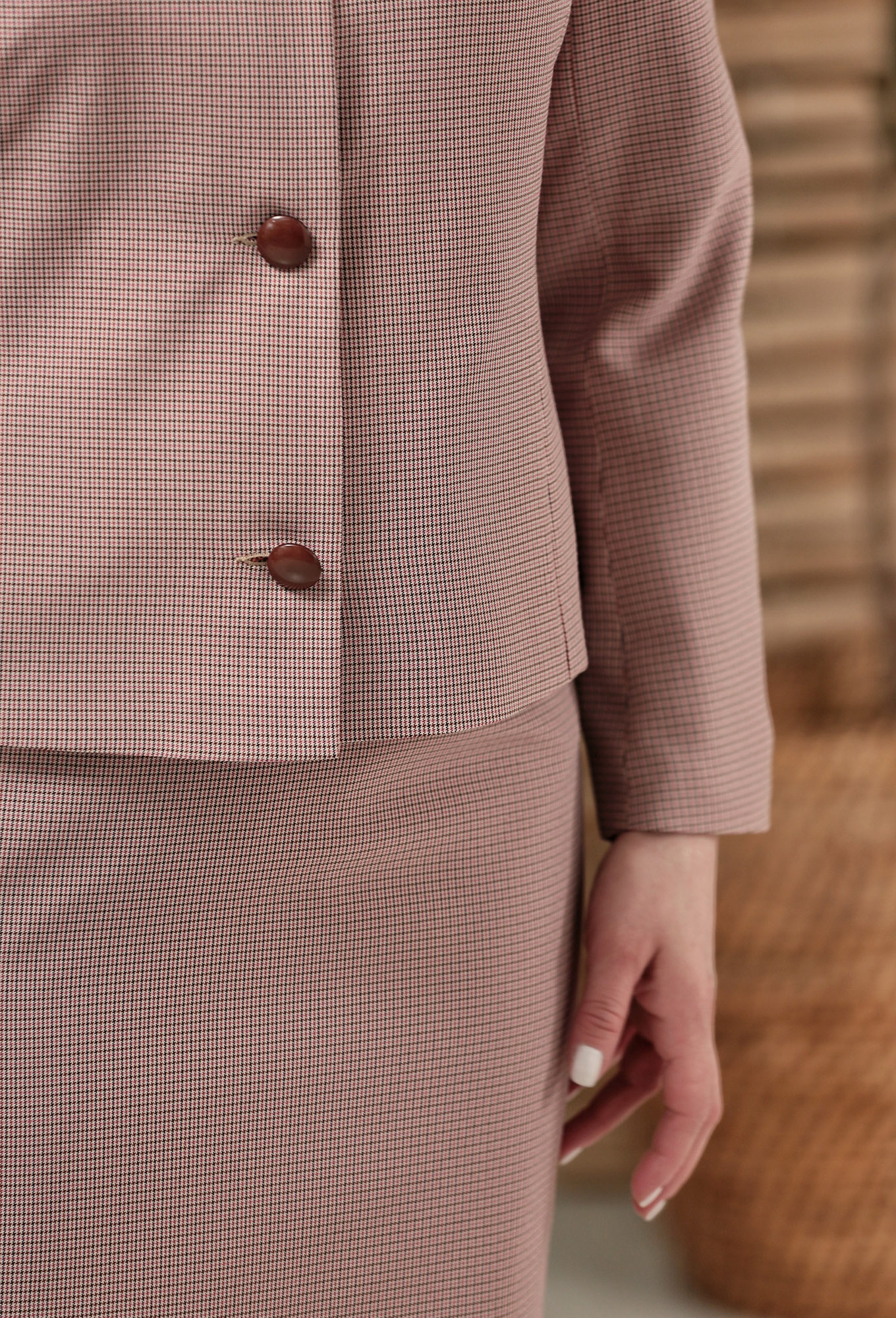 Модель: Анастасия Мак 779 розовая клетка..показатьli> Рост: 164 см (девушка на фото ростом 170см) Сезон: круглогодичный Тип ткани: Вискоза-65%; ПЭ-35%Костюм состоящий из жакета и юбки. Жакет полуприлегающего силуэта. Полочка жакета с центральной застежкой на четыре петли и пуговицы, вертикальными рельефами, нагрудной вытачкой. Горловина круглой формы. Спинка со средним швом и вертикальными рельефами. Рукав длинный втачной, двухшовный. Жакет на подкладке. Юбка классическая, облегающая бедра и зауженная к низу, на подкладке, длиной слегка за колено. Передняя часть юбки с талиевыми вытачками, задняя часть также с талиевыми вытачками и средним швом, в верхней части которого обработана потайная молния, в нижней части шлица. Пояс юбки притачной, с эластичной тесьмой и застежкой на петлю и пуговицу. Юбка на подкладке.li>