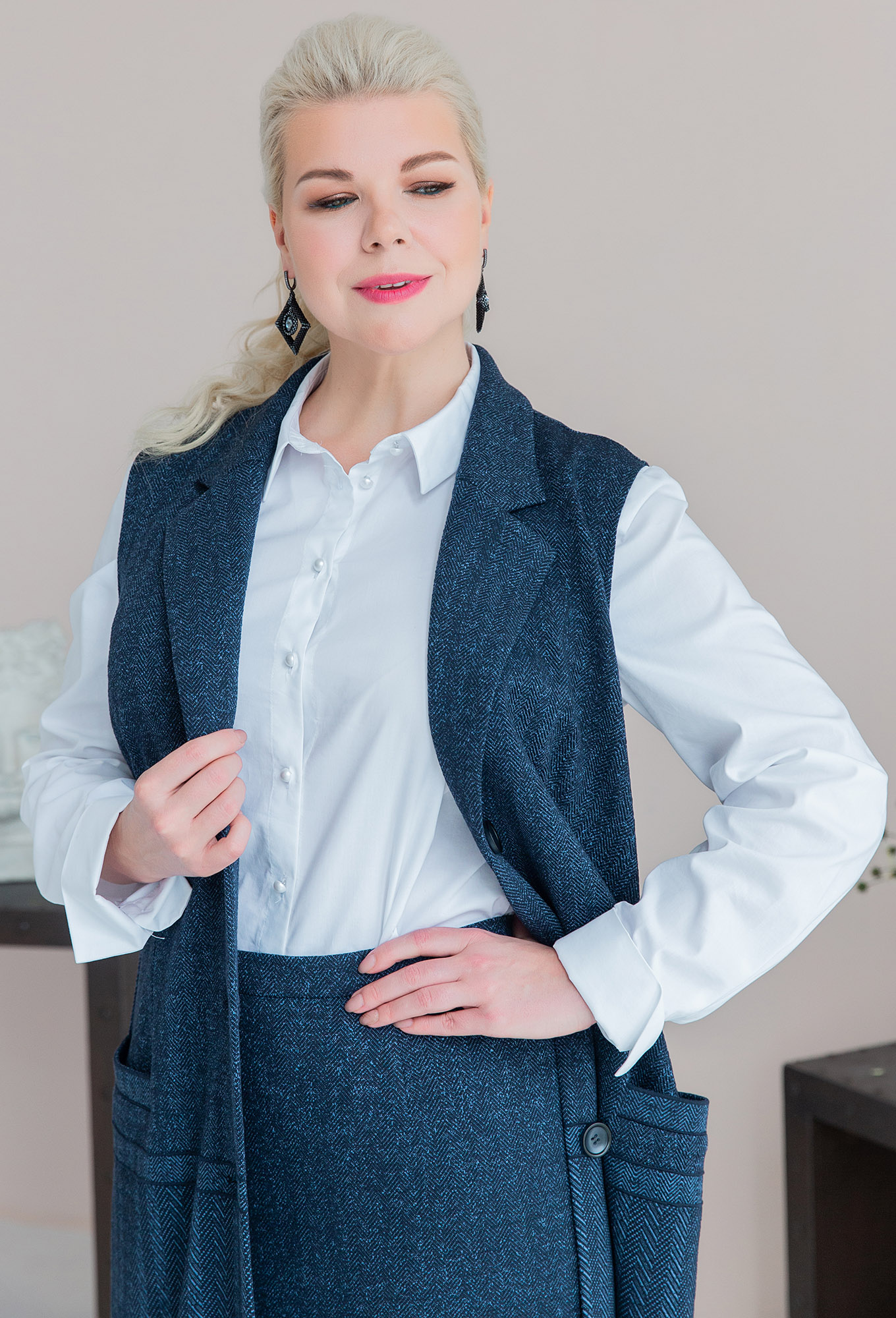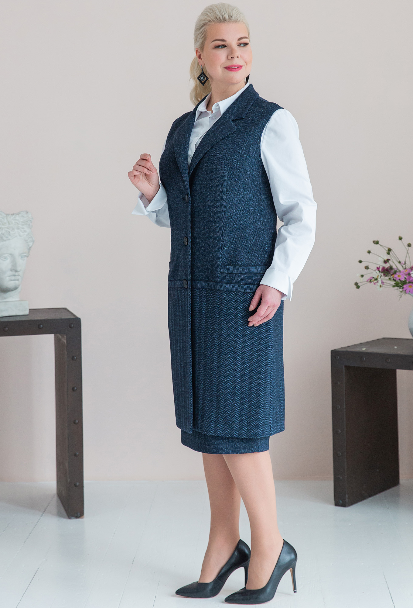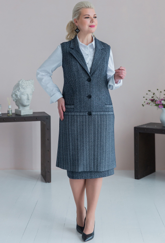 Модель: АСВ 2452/2373 синий Рост:..показать 164 см (девушка на фото ростом 170см) Сезон: Осень-Зима Тип ткани: ПЭ 65%, вискоза 30%, эластан 5%Жилет прямого силуэта с пиджачным воротником и застежкой на петли и пуговицы. По переду карманы с листочкой в шве. По спинке по низу изделия – шлица.