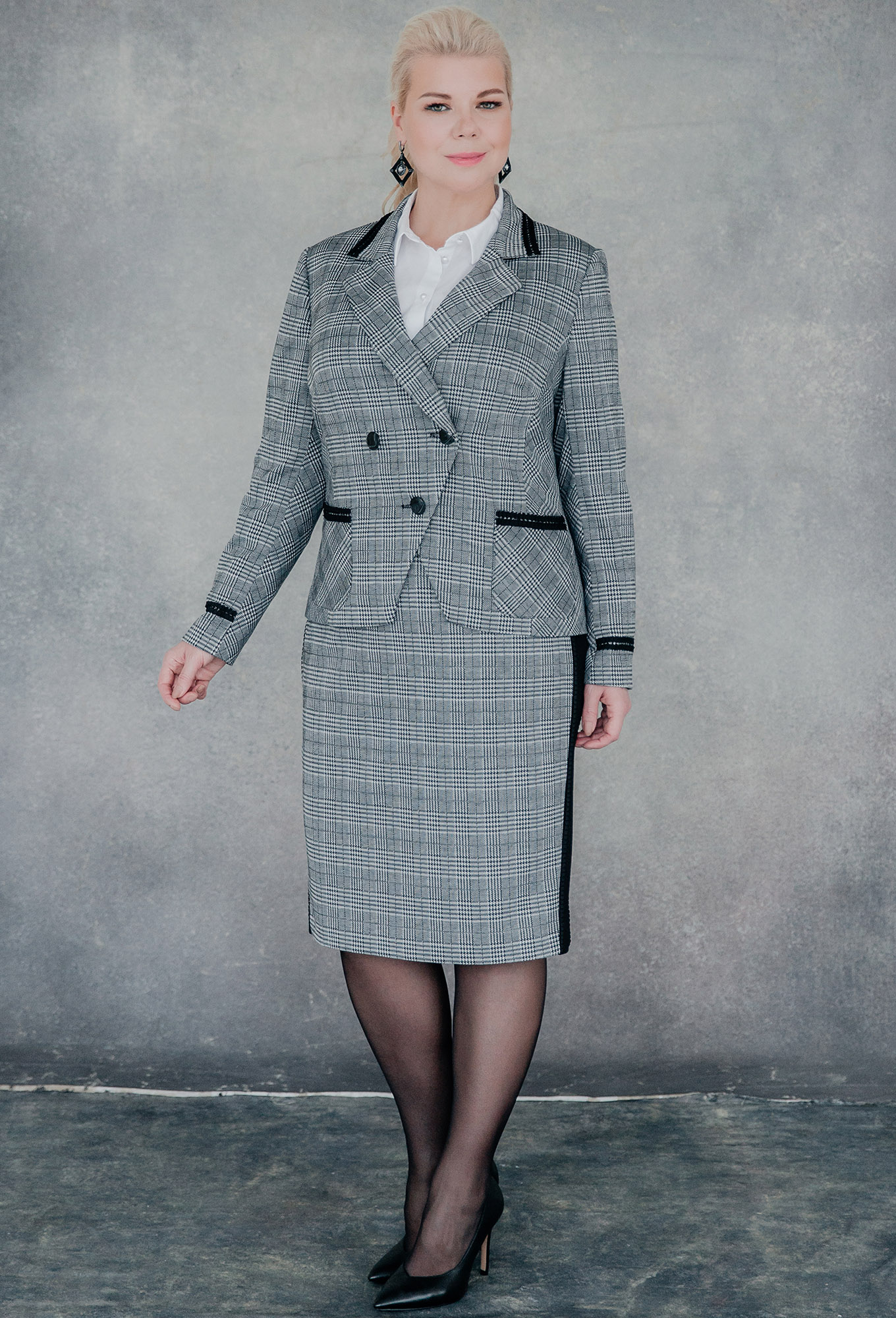 Длина жакета - 60см, юбка - 64см. li>Рост: 164 см (девушка на фото ростом 170см) Сезон: Осень-Зима Тип ткани: Вискоза 60%, нейлон 34%, спандекс 6%Подкладка- Вискоза 95%, эластан 5%