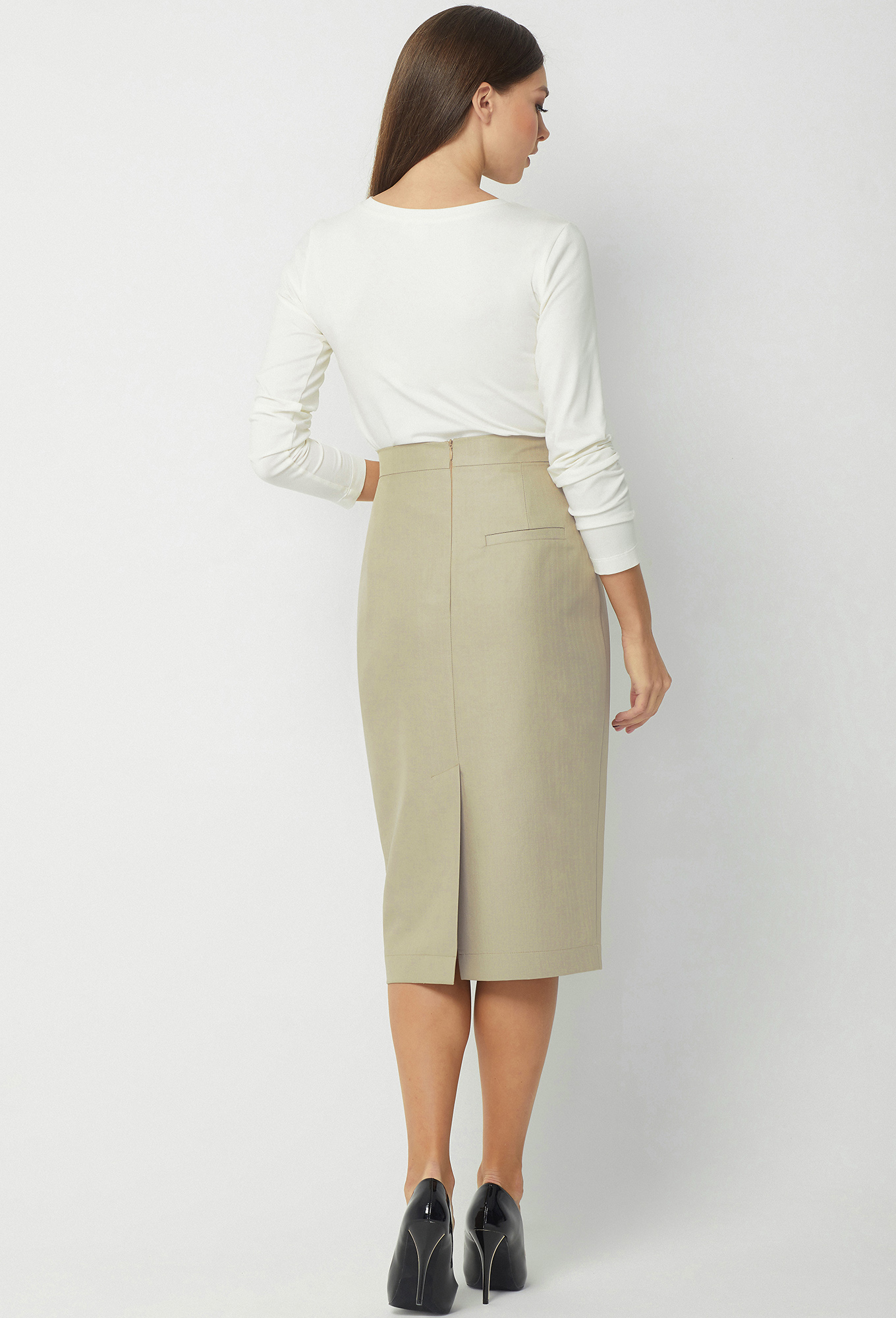 Юбка-миди с притачным поясом, задняя половинка со средним швом, в котором обработана потайная молния, шлица и горизонтальным карманом-обманкой с отделочной пуговицей.