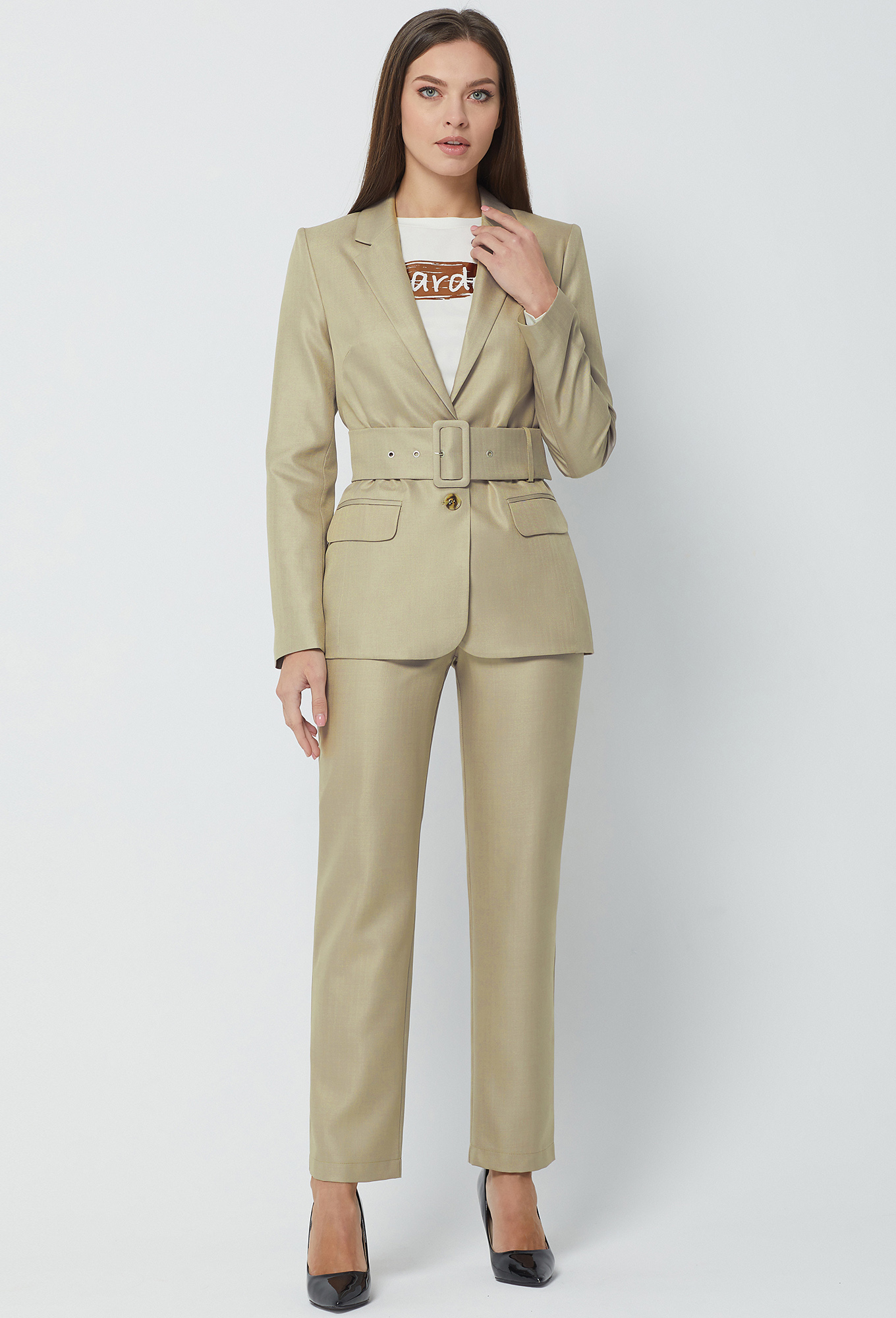 Модель: Базалини 3830/3845 песочный <..показатьli>Рост: 170 см (девушка на фото 170см) Сезон: Круглогодичный Тип ткани: Полиэстер- 65%, Вискоза- 32% , Эластан- 3%Жакет полуприлегающего силуэта с центрально-бортовой застёжкой на две петли-пуговицы. Перед с горизонтальными параллельными клапанами и рамками. Рукава втачные двухшовные. Воротник отложной с лацканами. На подкладке. Дополняется широким поясом с пряжкой из основной ткани.