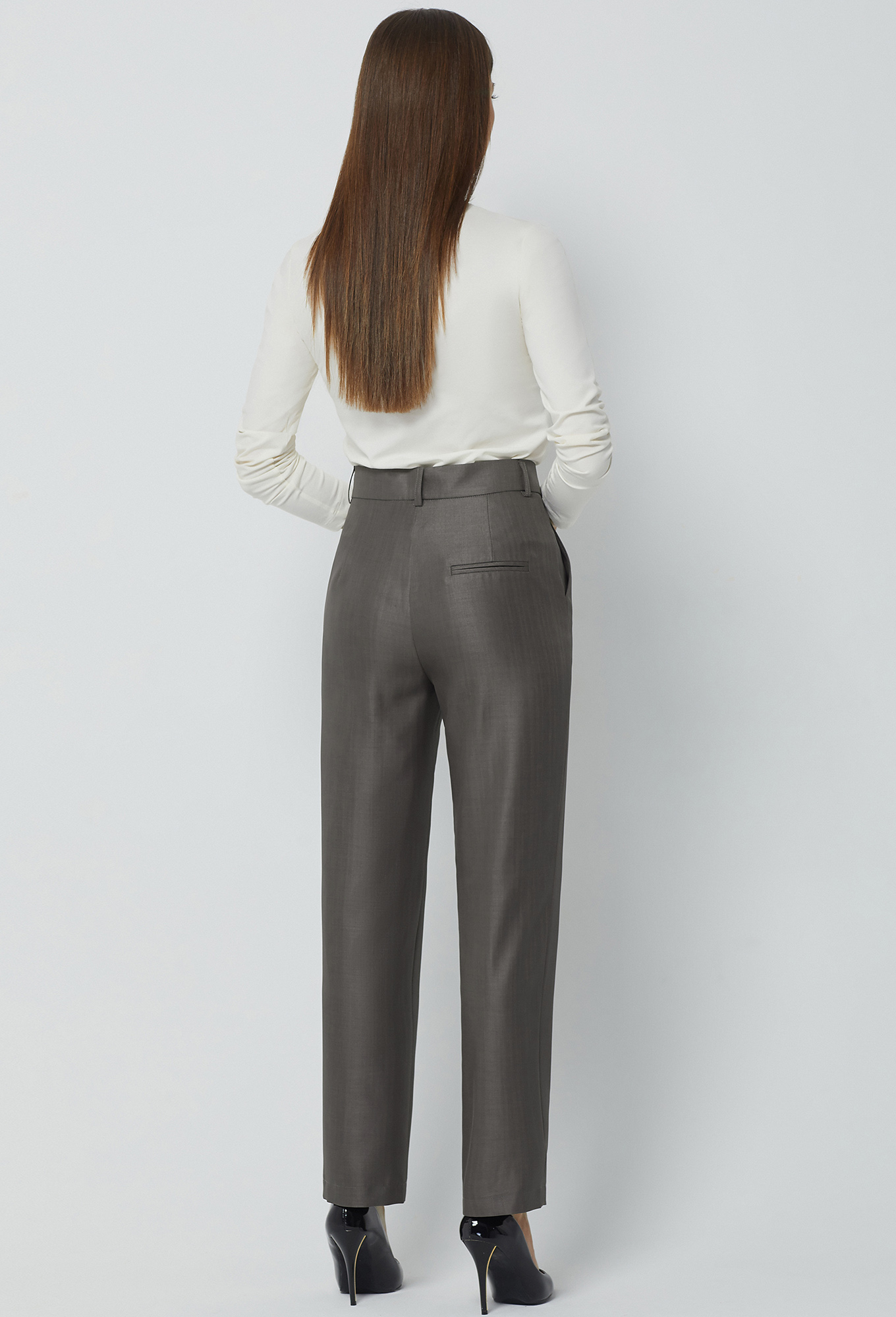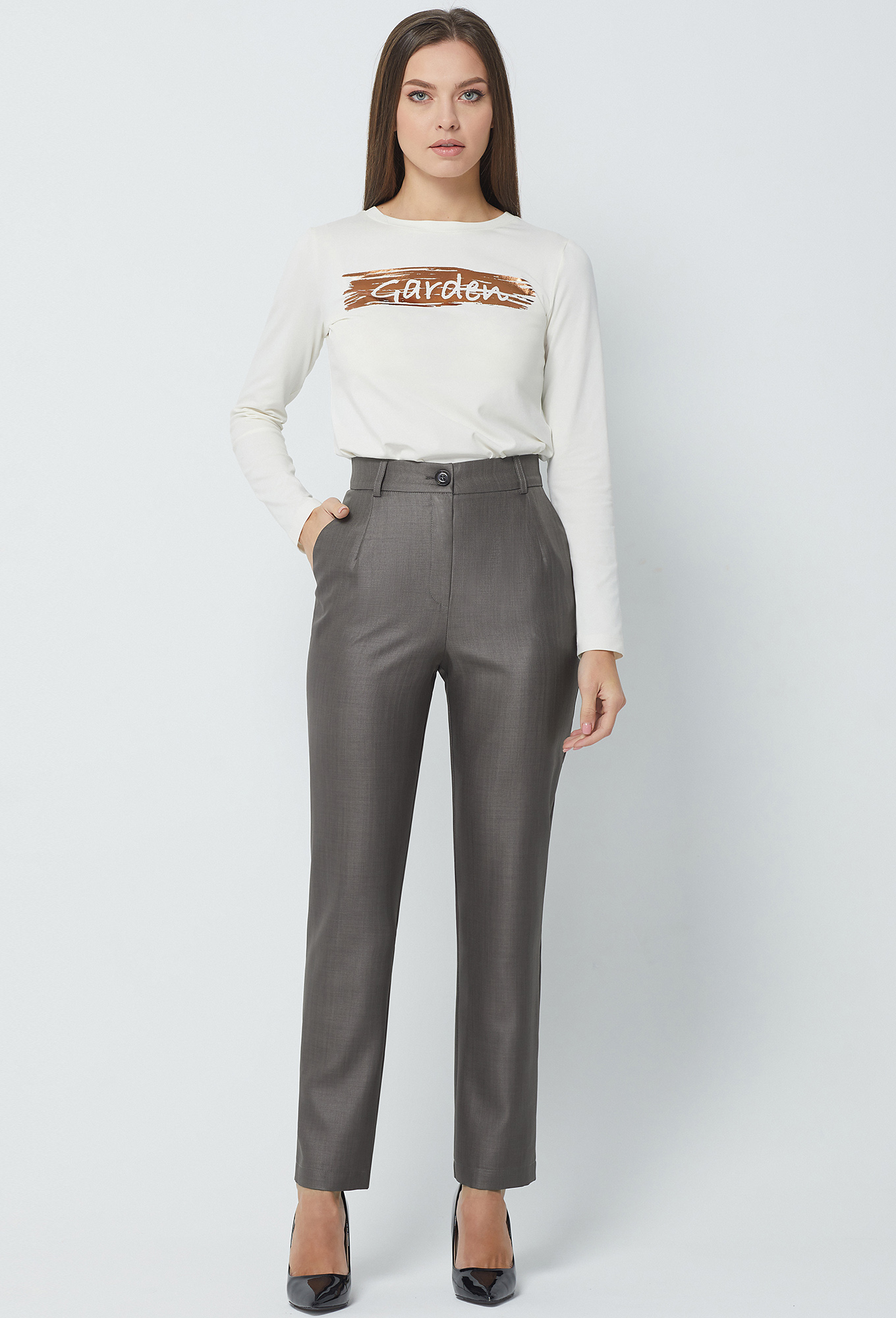Брюки на притачном поясе со шлёвками с застёжкой на молнию и две петли-пуговицы, передние части с косыми карманами, задняя правая часть с карманом-обманкой с рамками.