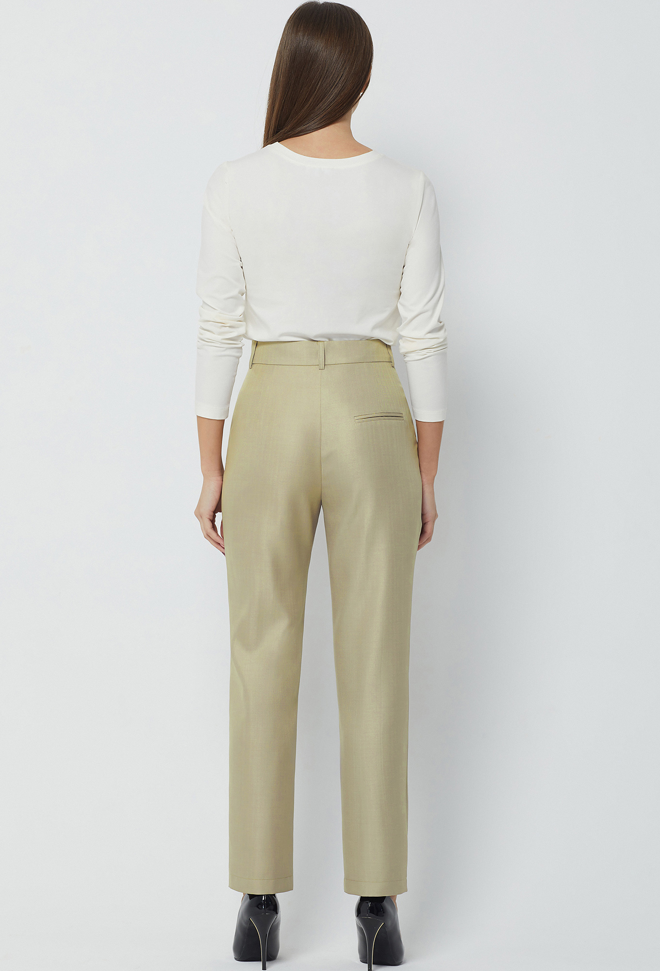Брюки на притачном поясе со шлёвками с застёжкой на молнию и две петли-пуговицы, передние части с косыми карманами, задняя правая часть с карманом-обманкой с рамками.