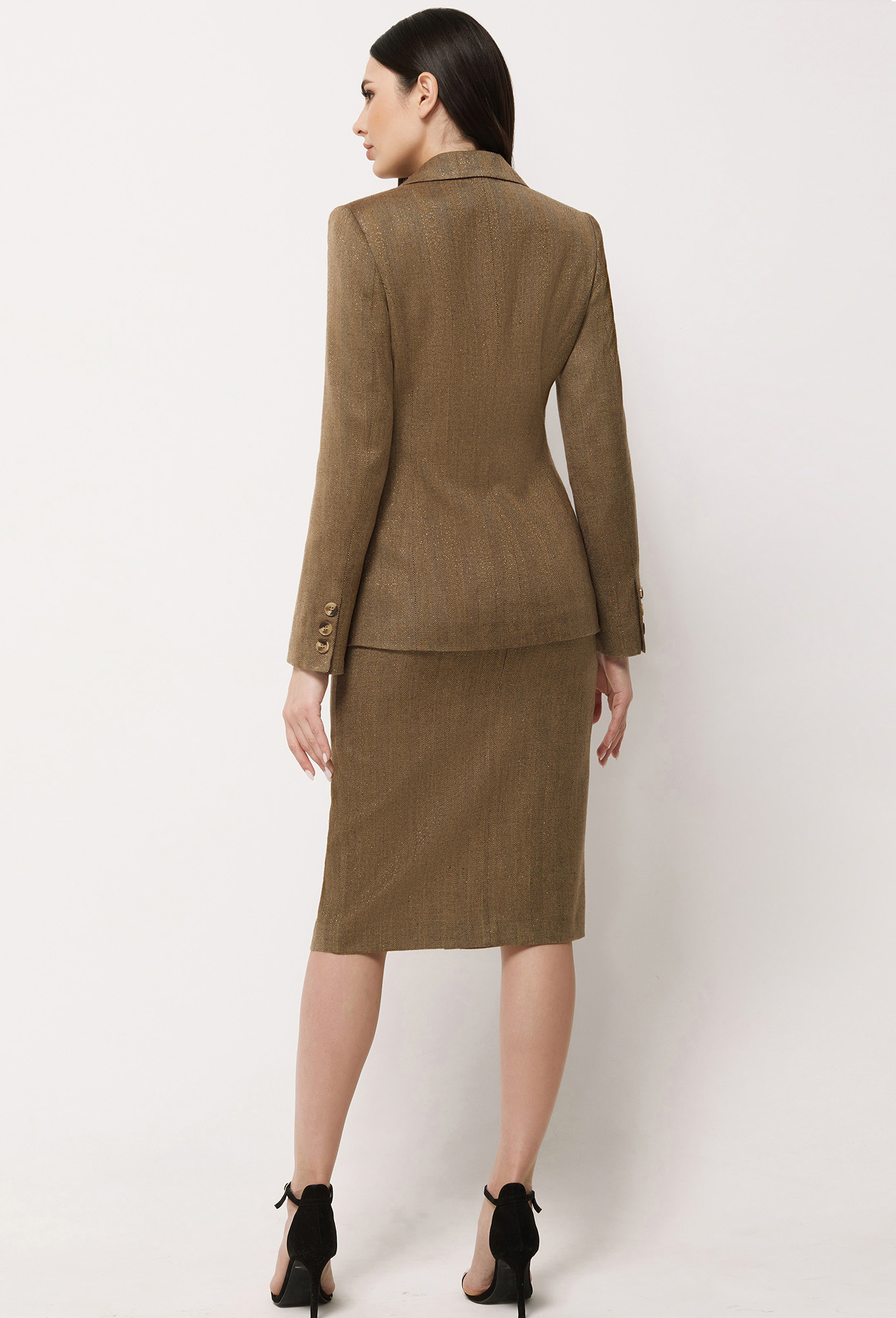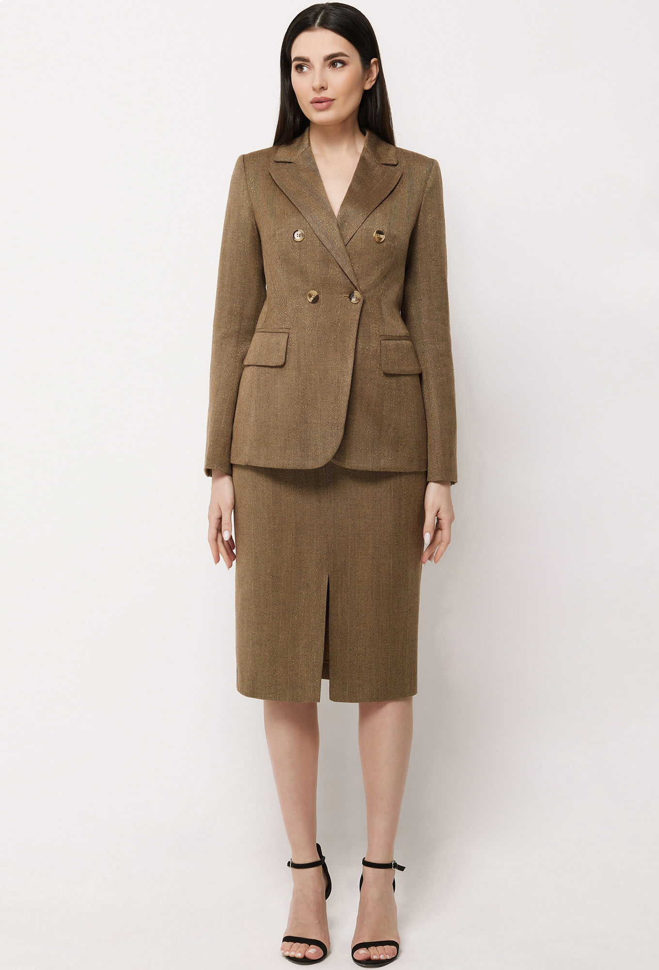 Модель: Базалини 3864/3895 коричневый..показать Рост: 170 см (девушка на фото 170см) Сезон: Осень-Зима Тип ткани: 64% Полиэстер, 32% Вискоза, 2% Эластан, 2% Метал. нитьДвубортный жакет с застёжкой на петли. Спинка со средним швом. Рукава втачные двухшовные со шлицами и декоративными пуговицами. Воротник отложной с лацканами. Жакет на подкладке с плечевыми накладками.