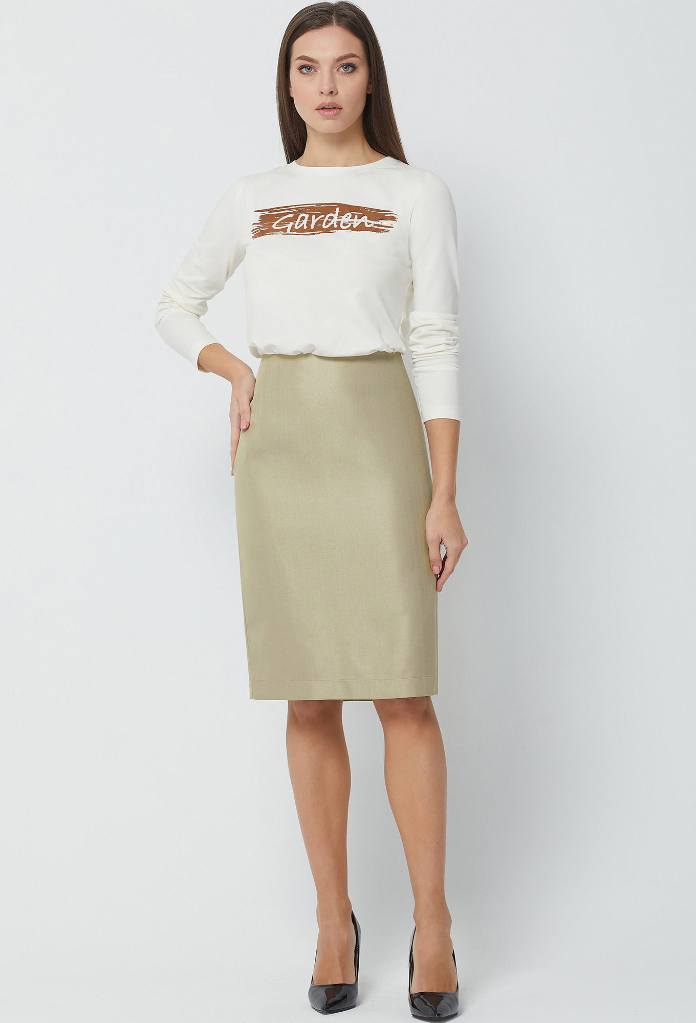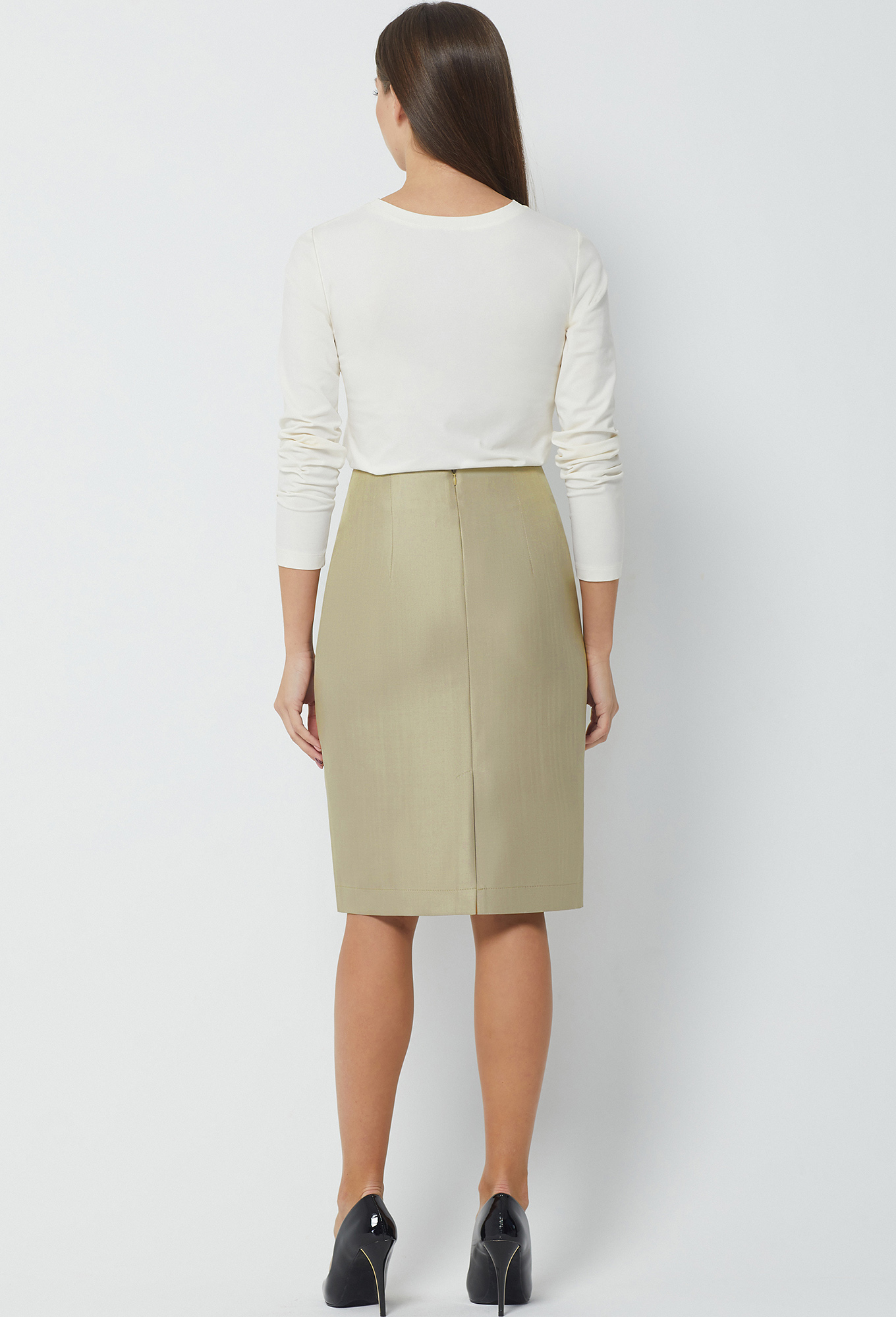 Юбка карандаш на обтачке, в среднем шве спинки обработана потайная молния и шлица, на подкладке.