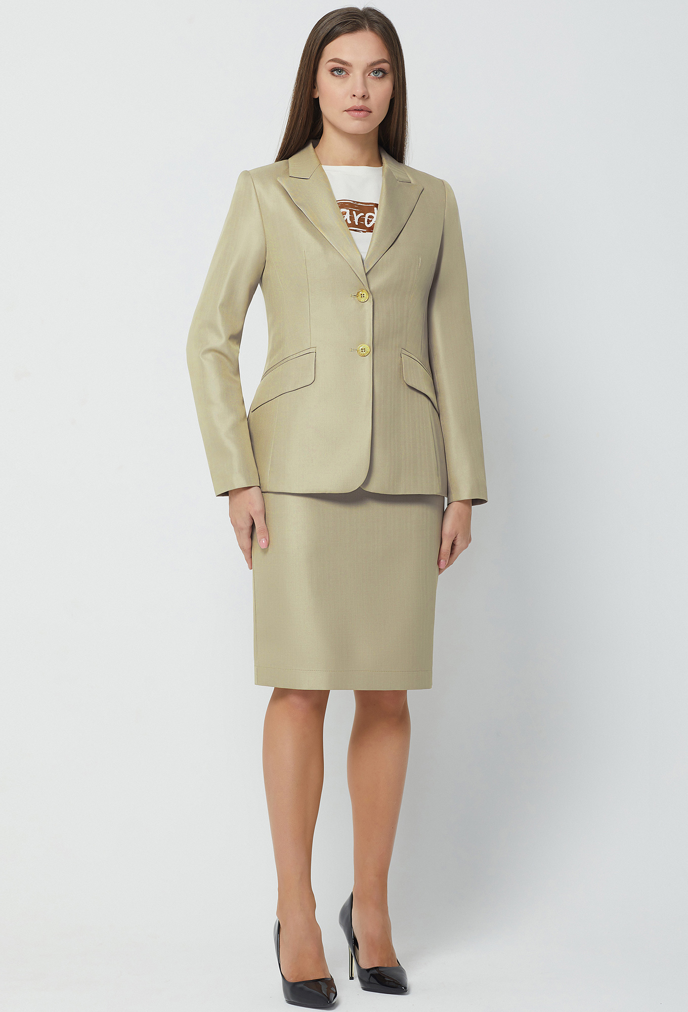 Модель: Базалини 4249 песочный Ро..показатьст: 170 см (девушка на фото 170см) Сезон: круглогодичный Тип ткани: 65% полиэстер, 32% вискоза, 3% эластанЮбка карандаш на обтачке, в среднем шве спинки обработана потайная молния и шлица, на подкладке._x000D_
