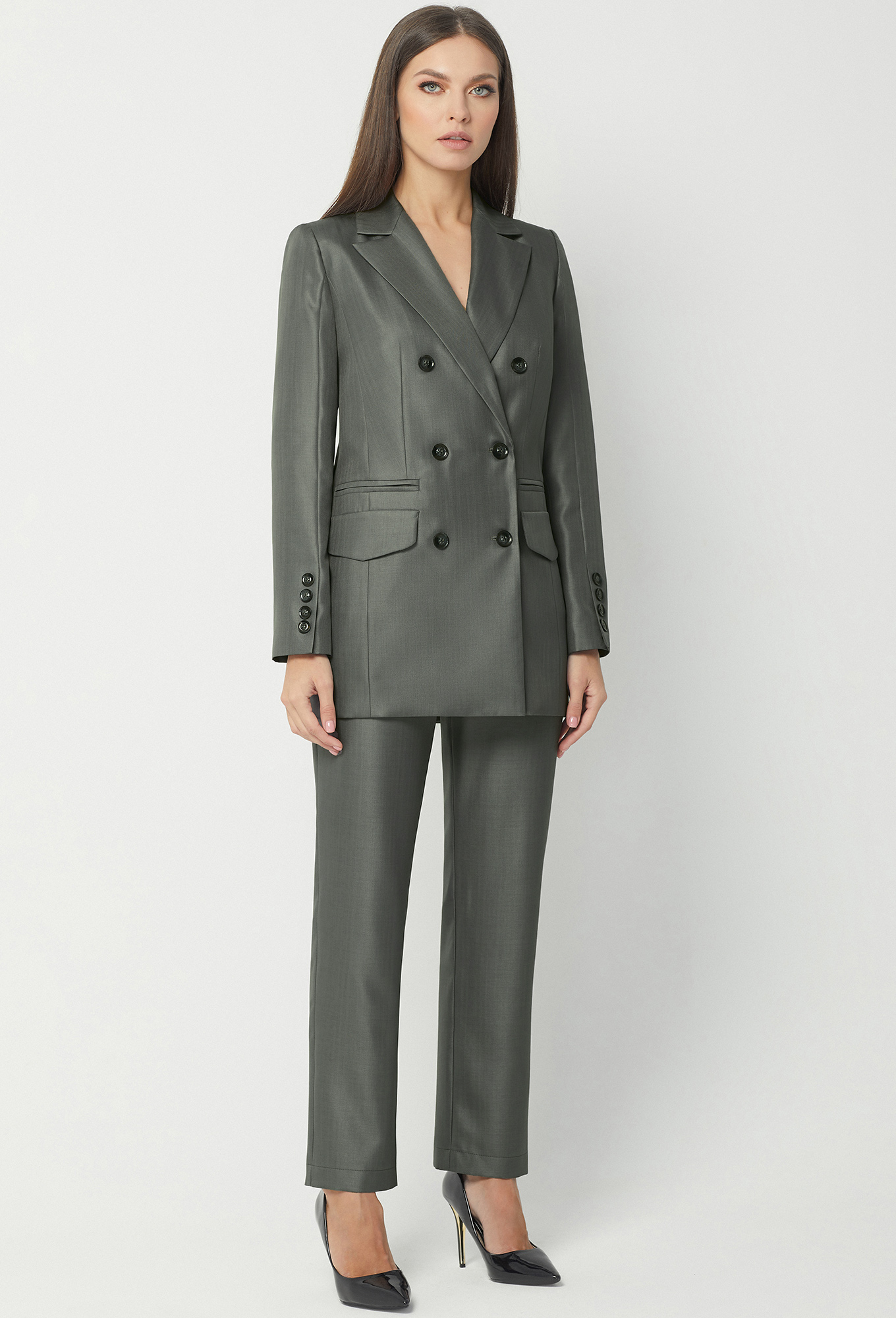 Длина жакета в 44р - 74см, рукава 62см. Длина брюк - 103см.Длина жакета в 52р - 76см, рукава 62см. Длина брюк - 103см. Рост: 170 см (девушка на фото 170см) Сезон: Круглогодичный Тип ткани: Полиэстер- 65%, Вискоза- 32% , Эластан- 3%