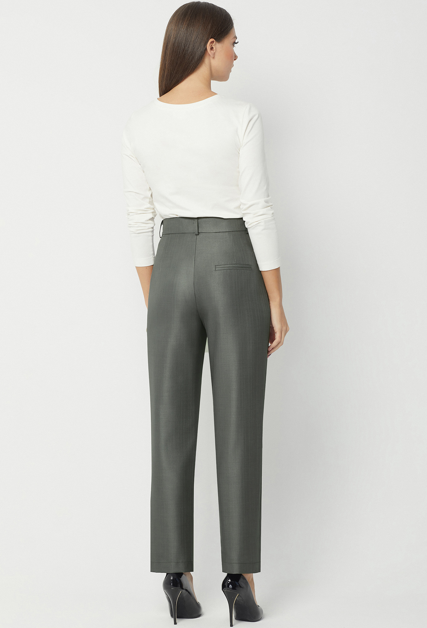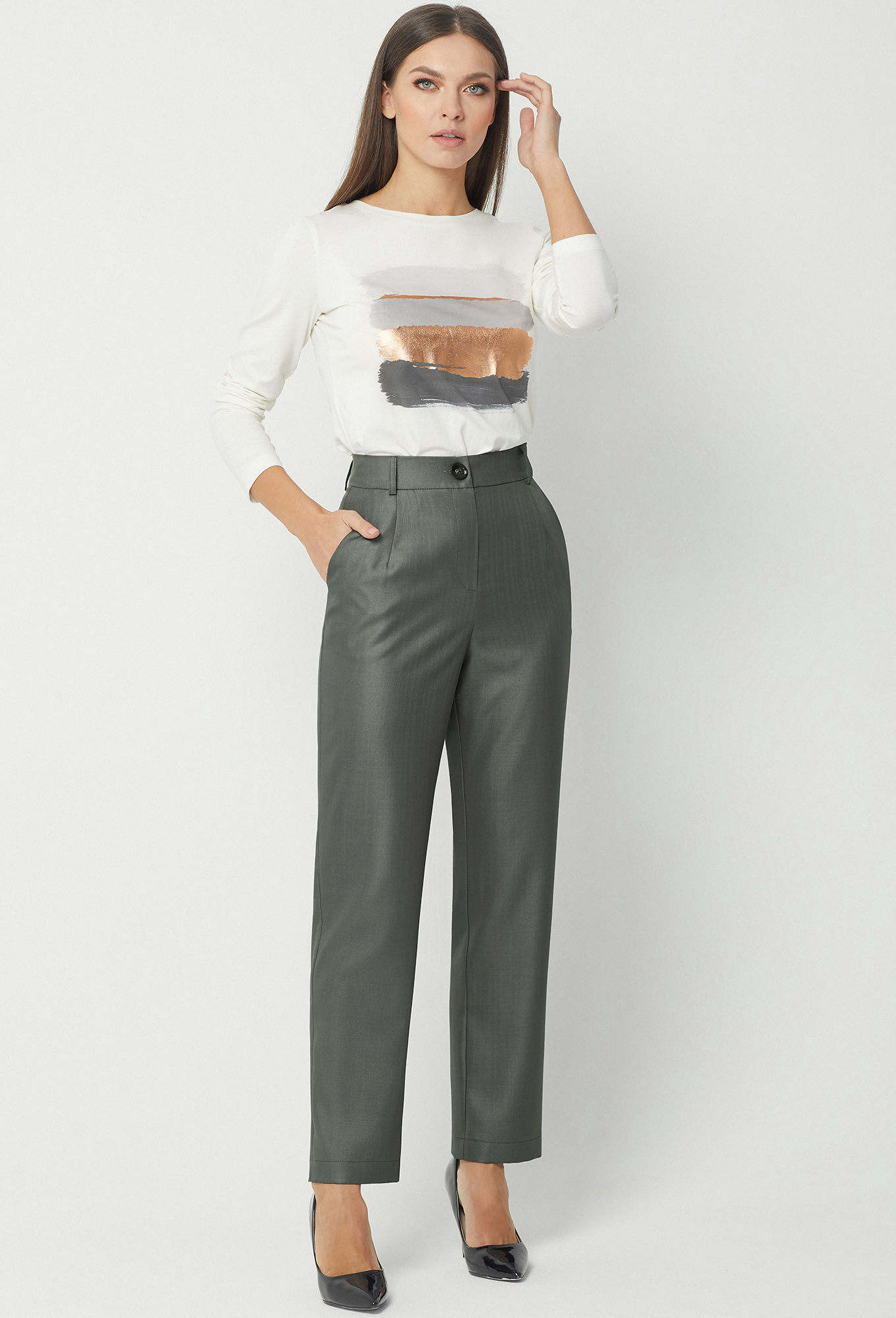 Брюки на притачном поясе со шлёвками, с застёжкой на молнию и две петли-пуговицы. Передние части с косыми карманами. Задняя правая часть с карманом-обманкой с рамками.