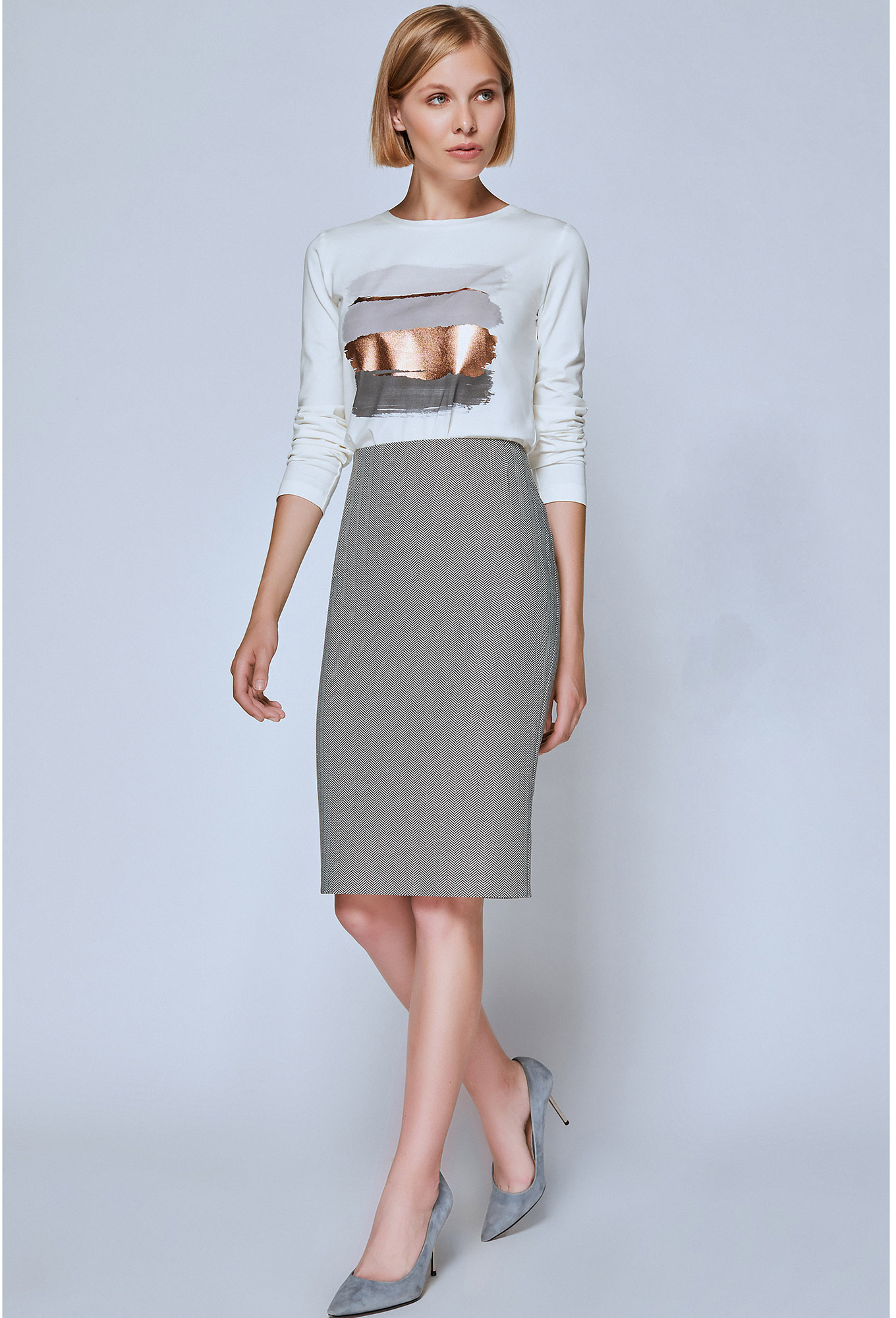Юбка карандаш на обтачке, в среднем шве спинки обработана потайная молния и шлица, на подкладке.